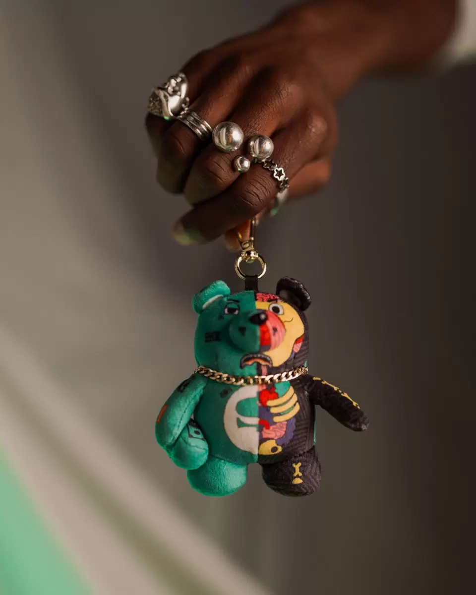 The Perfect Accessory. Plush bear keychain with split skeleton design and gold chain