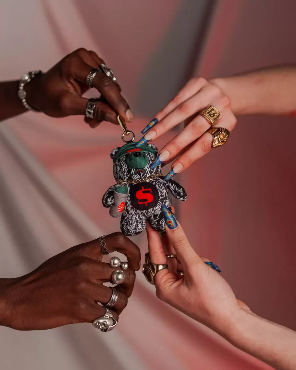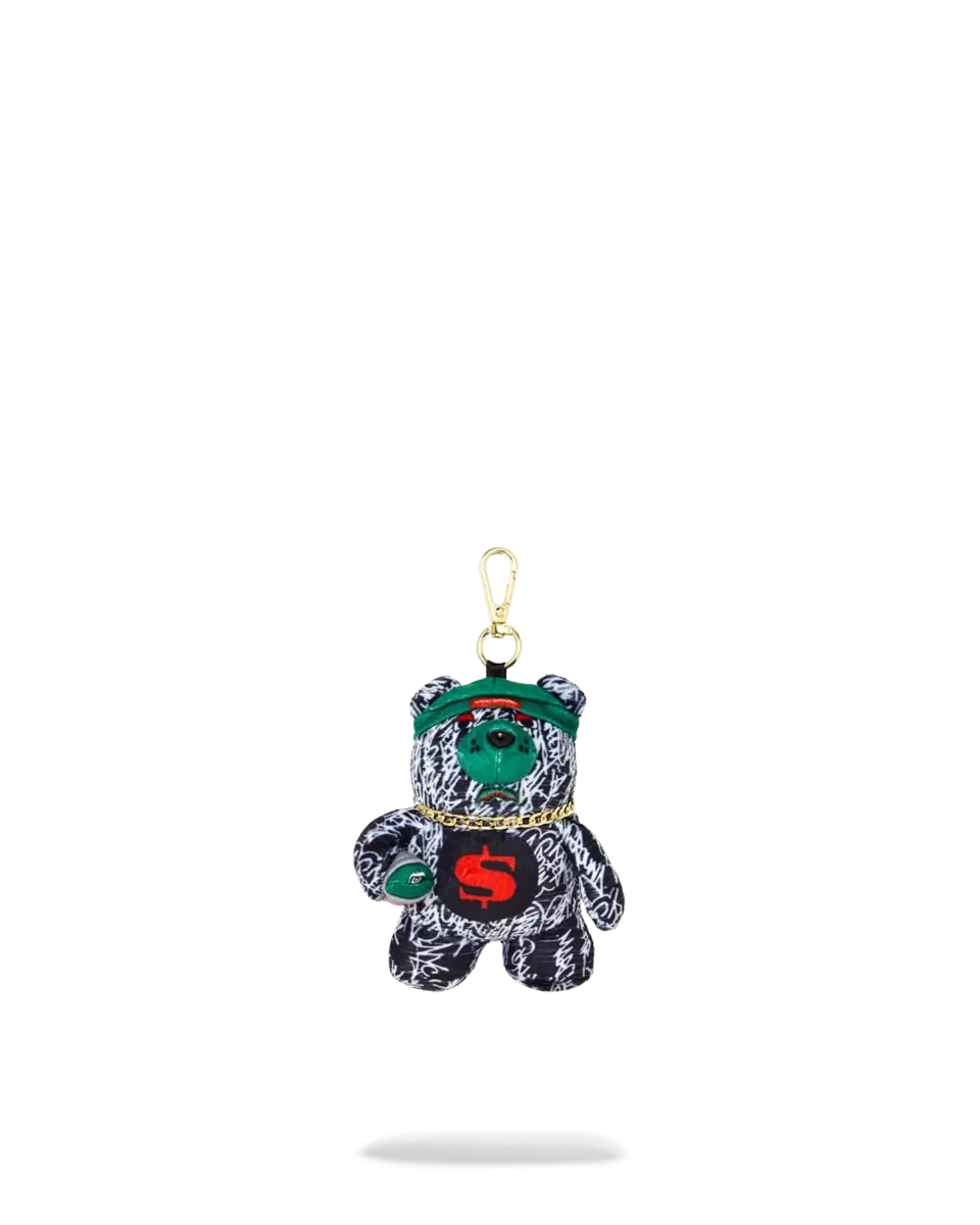 The Perfect Accessory. Plush bear keychain with miniature hat and spraypaint can and chain