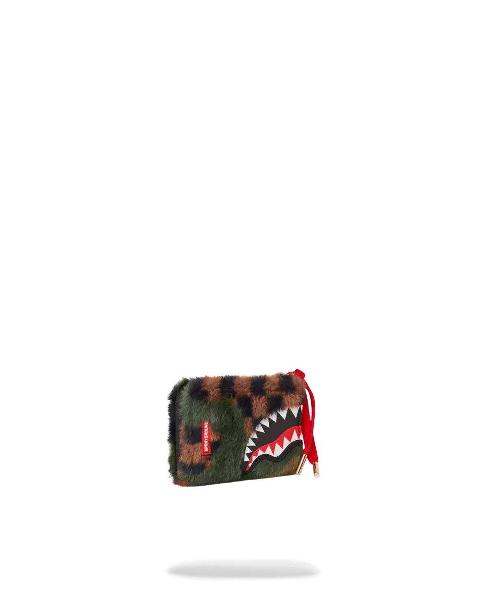 100% Polyester Faux fur printed in our custom check/ camo patterns Wallet 4 interior pockets for cash & cardsZip Closure3” x 4.5” x 0.75”