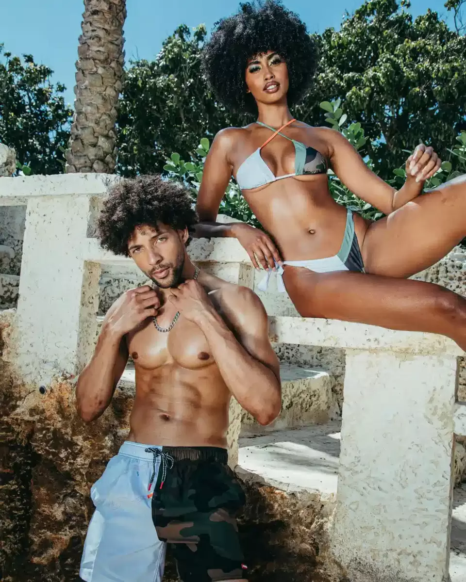 MATERIAL COMPOSITION:83% polyester 17% elastaneFeatures:Vertical Sharkmouth printed contrast bandFunctional VSM side tiesV front and back waistband