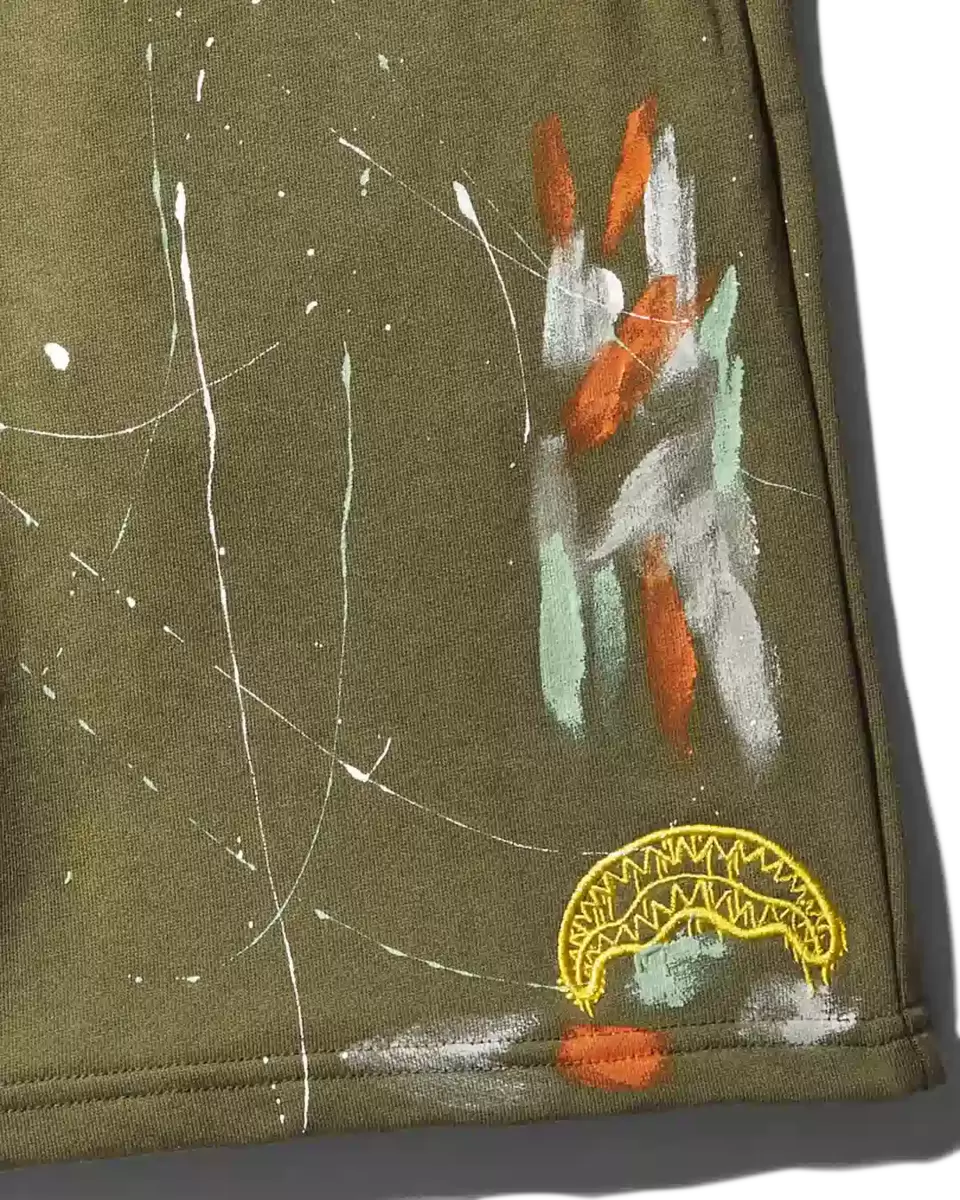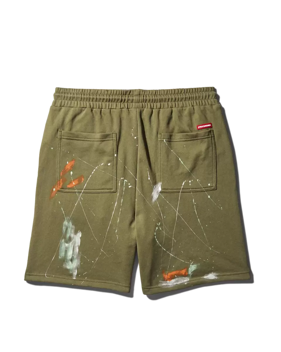 MATERIAL COMPOSITION 100% COTTON FEATURES Cinched waistband with drawcord with metal tips Side front pockets Back patch pockets Uneven all over paint splat prin