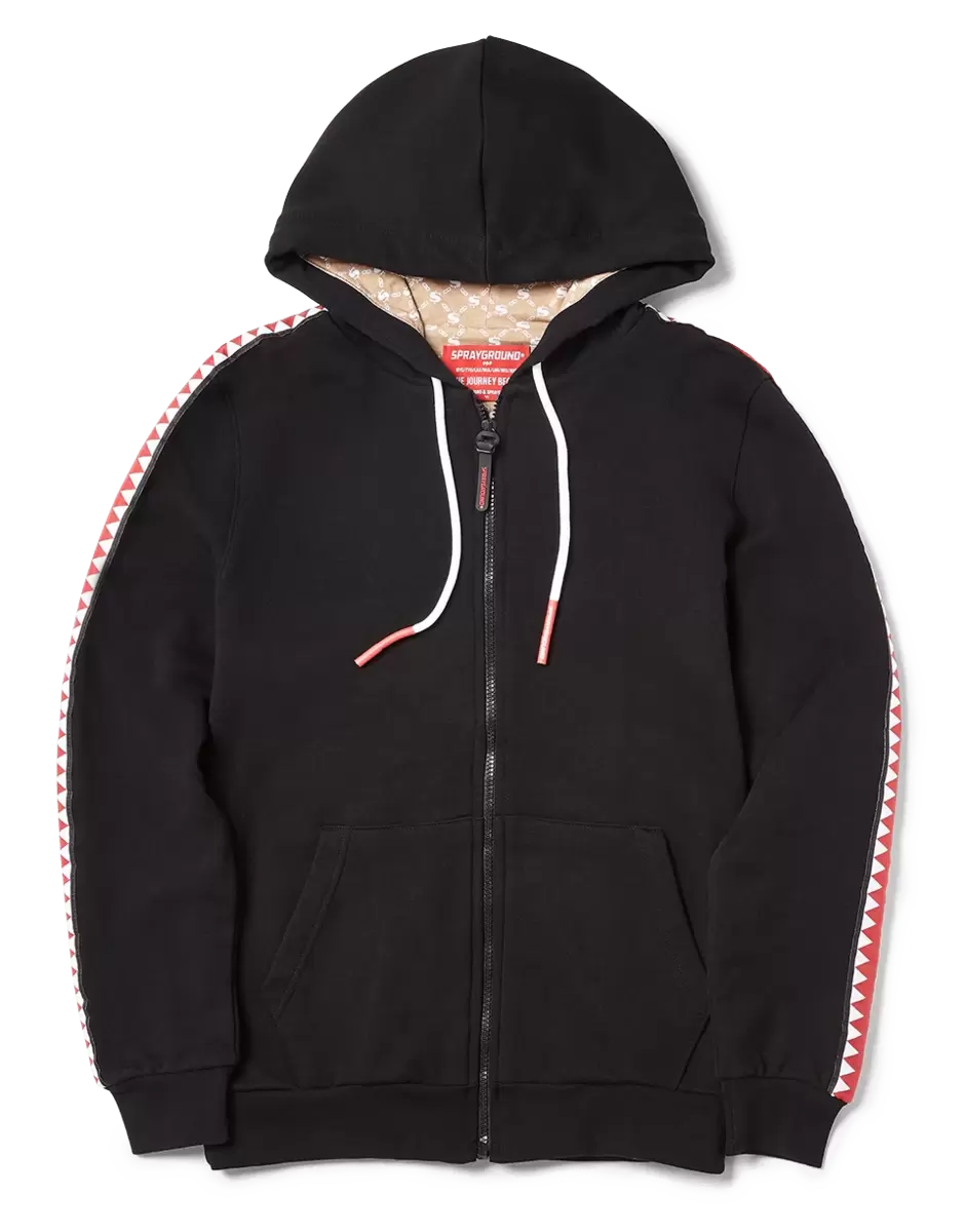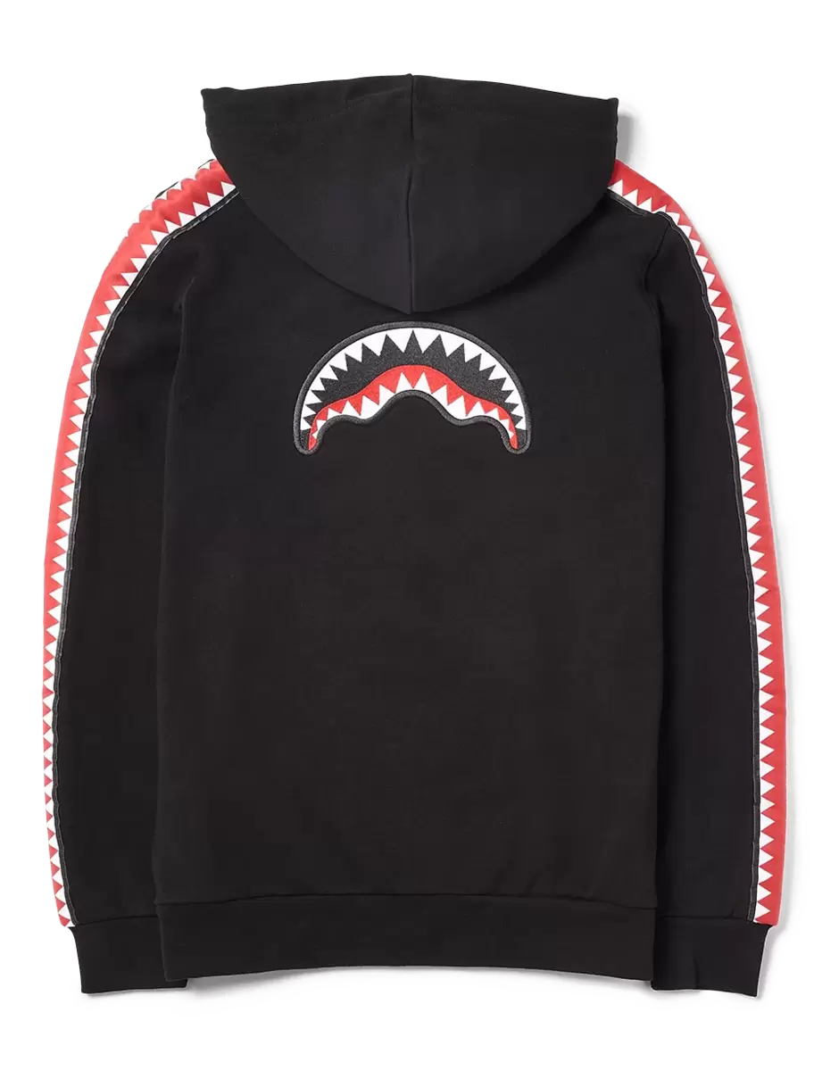 | 100% Cotton Zip front Hooded Sweatshirt Front Pocket Printed Lining detail in hood Drawstring Hood Embroidered Back Panel Vertical Shark Mouth taping on Sleeves |