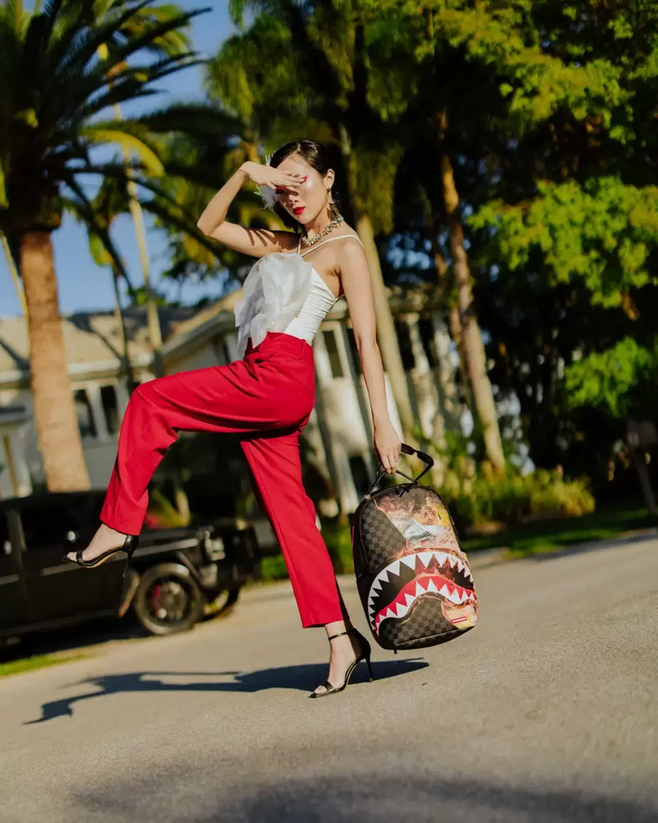 Dimensions: 18″ x 6″ x 11.5″ Front zipper pocket Side pockets Zippered Stash pocket Separate velour sunglass compartment Ergonomic mesh back padding Adjustable Straps for custom sizing Gold zippers with metal hardware Metal “Sprayground Authentic” badge Slide through back sleeve connects to carry-on luggage to free your hands
