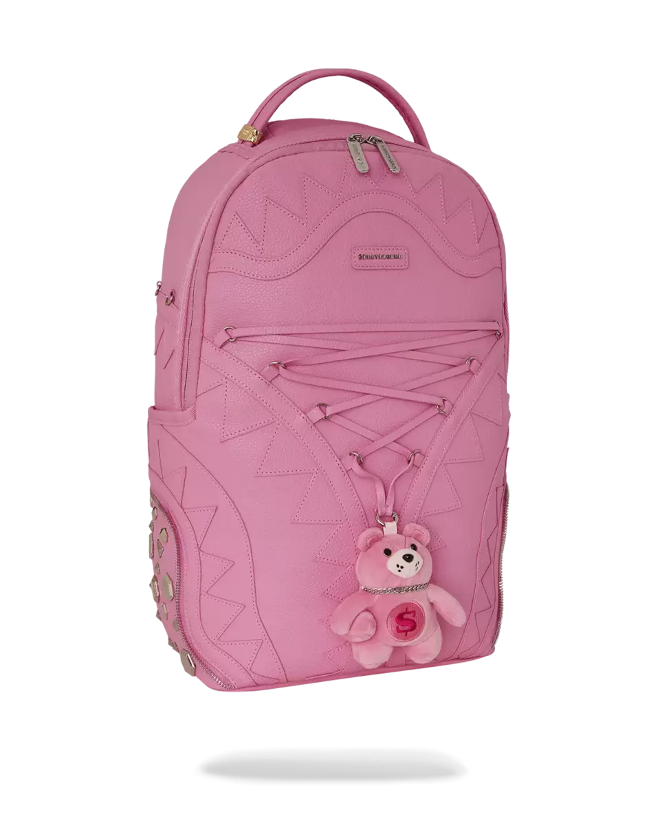 PVC with double sharkmouth cut and sew details, decorative zipper detailing includes a plush bear hanging from the center, laced pvc trim, side panels decorated with silver metal studs