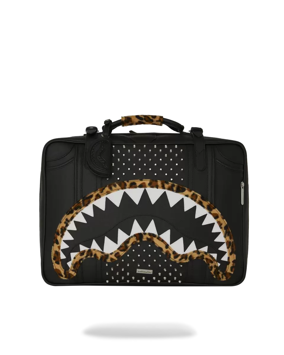 Features: Leather handle, secure buckle closure, whip stitching features, vertical sharkmouth embossed details, converts from backpack to handheld briefcase, embossed sharkmouth, includes luggage tag, 2 exterior zipper pockets, luggage sleeve, 4 interior mesh pockets, large interior pocket, clothing compression straps, includes adjustable backpack straps, embossed zipper pulls.