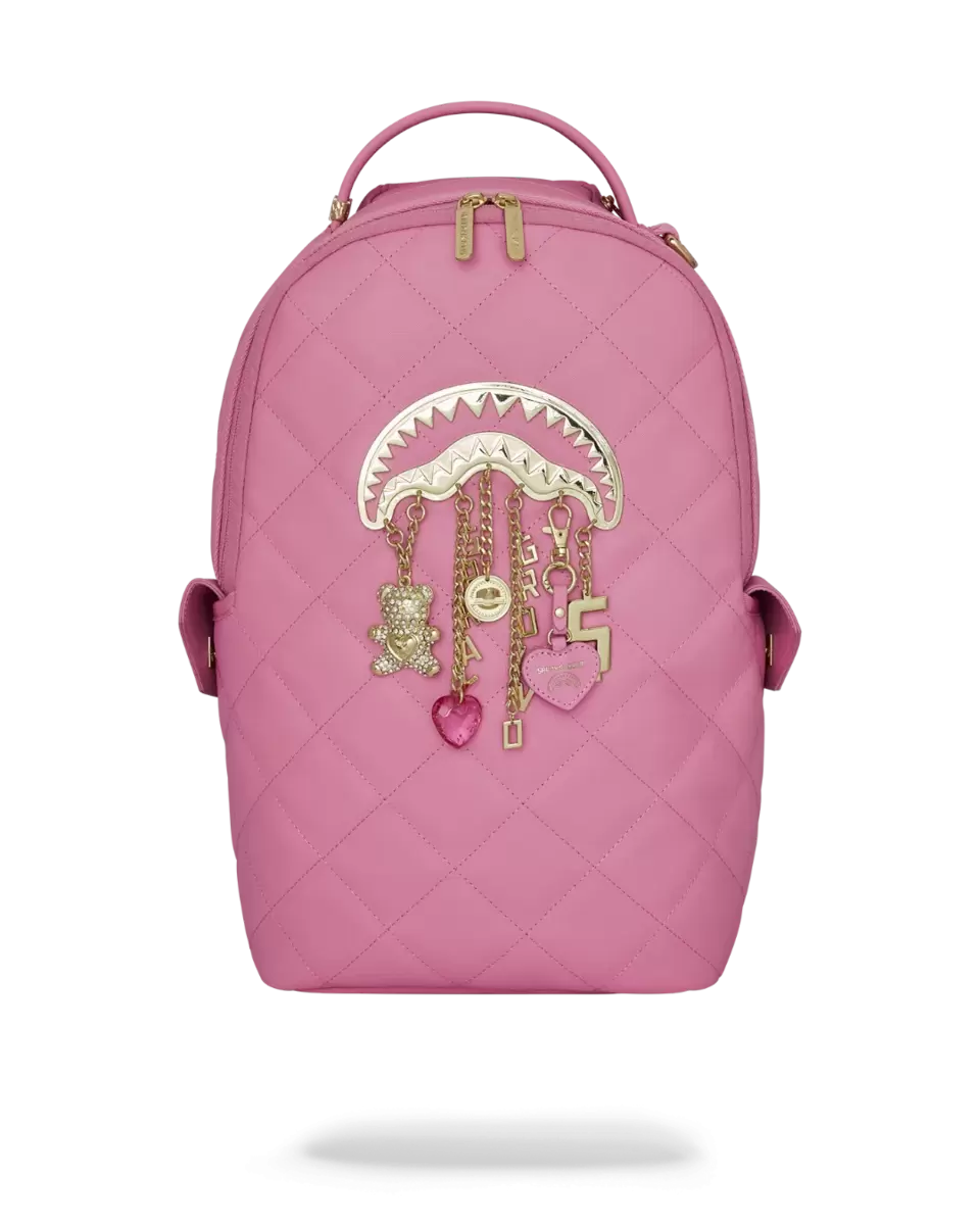 Quilted PVC backpack with gold metal sharkmouth with hanging metal and PVC charms attached. Handle with care!