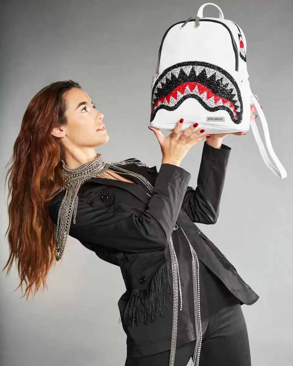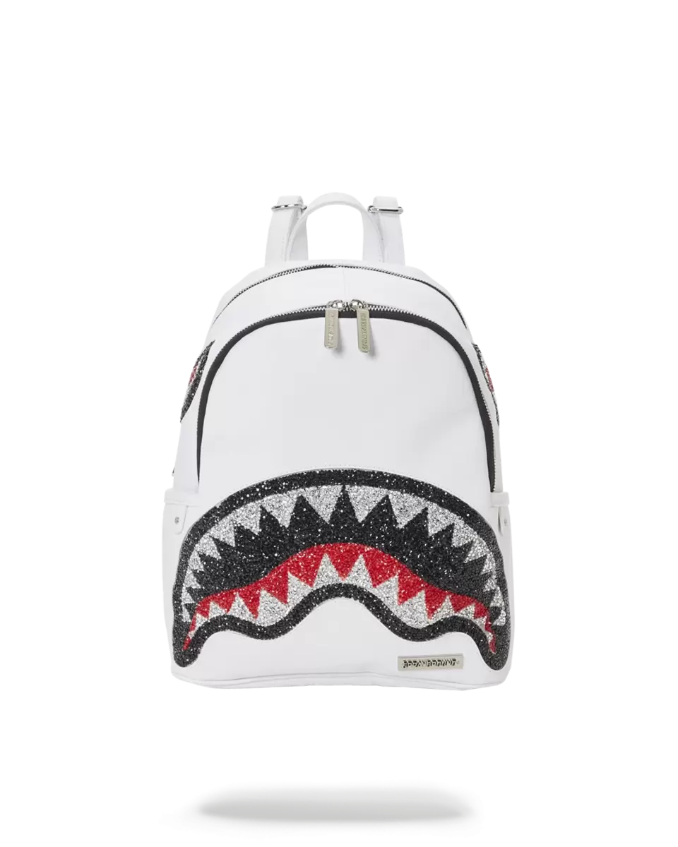 Crystal Embellishment Exterior Dimensions 10, x 5, x 11.5, Two large main zippered compartments, Side pockets, Zippered Stash pocket, Adjustable straps for