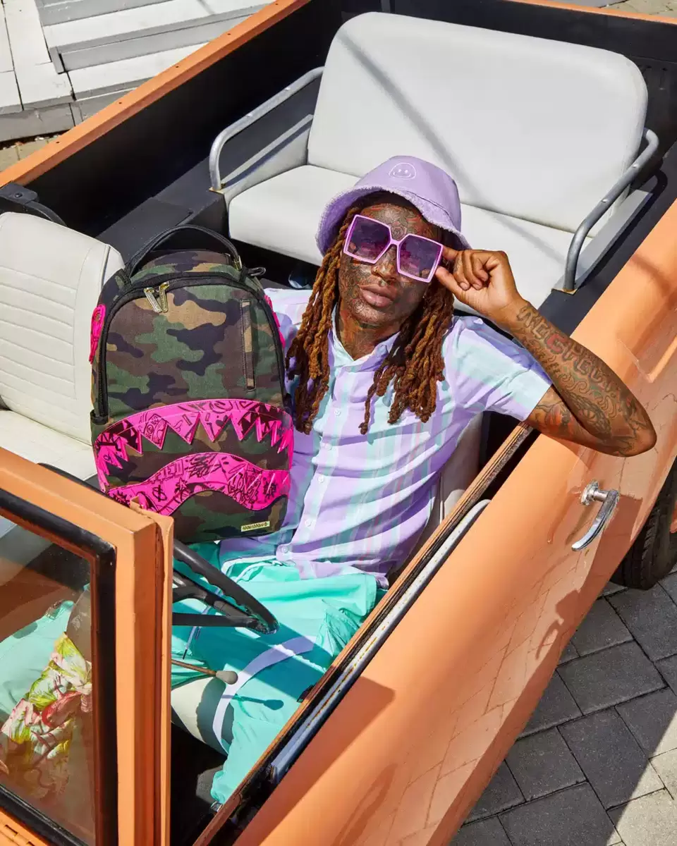 Dimensions: 18″ x 6″ x 11.5″ Rubber Shark Mouth Front zipper pocket Side pockets Zippered Stash pocket Separate velour sunglass compartment Ergonomic mesh back padding Adjustable Straps for custom sizing Gold zippers with metal hardware Metal “Sprayground Authentic” badge Slide through back sleeve connects to carry-on luggage to free your hands