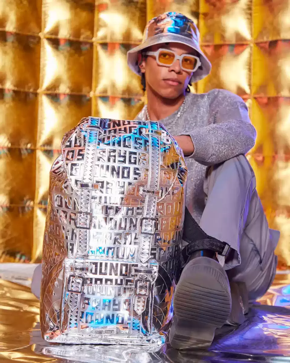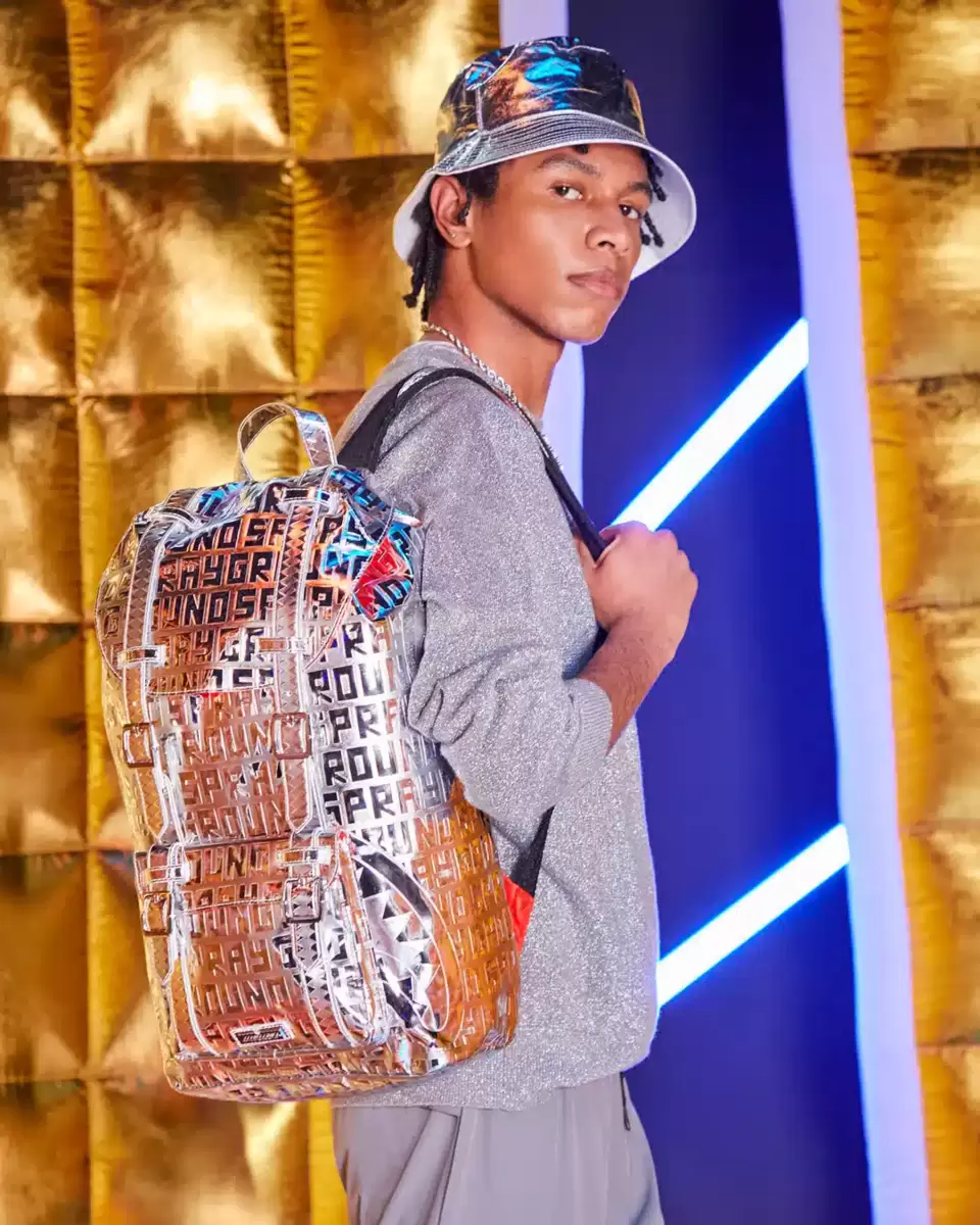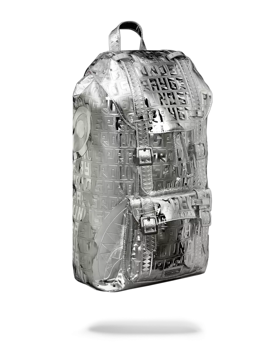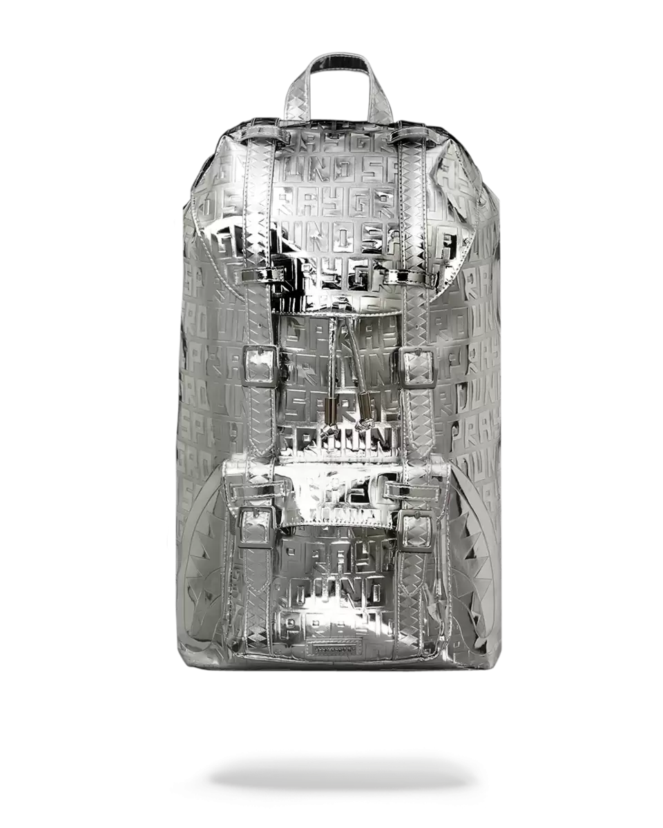 Embossed Sprayground logo on Metallic Silver PU with mirror-like shine