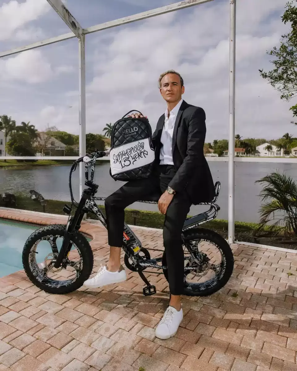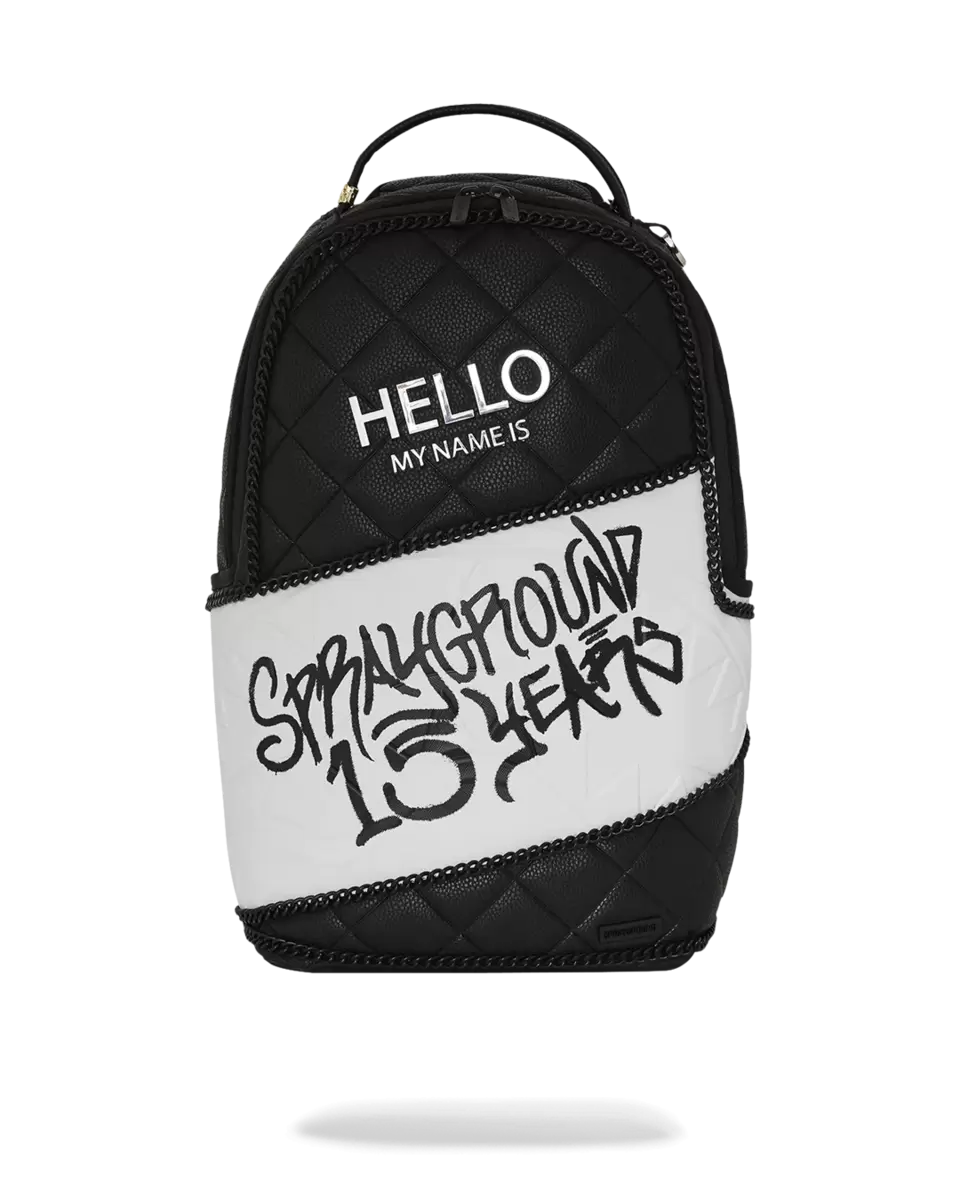 Quilted PVC backpack with chain details, embellished with metal letters, features exclusive 15 year backpack details