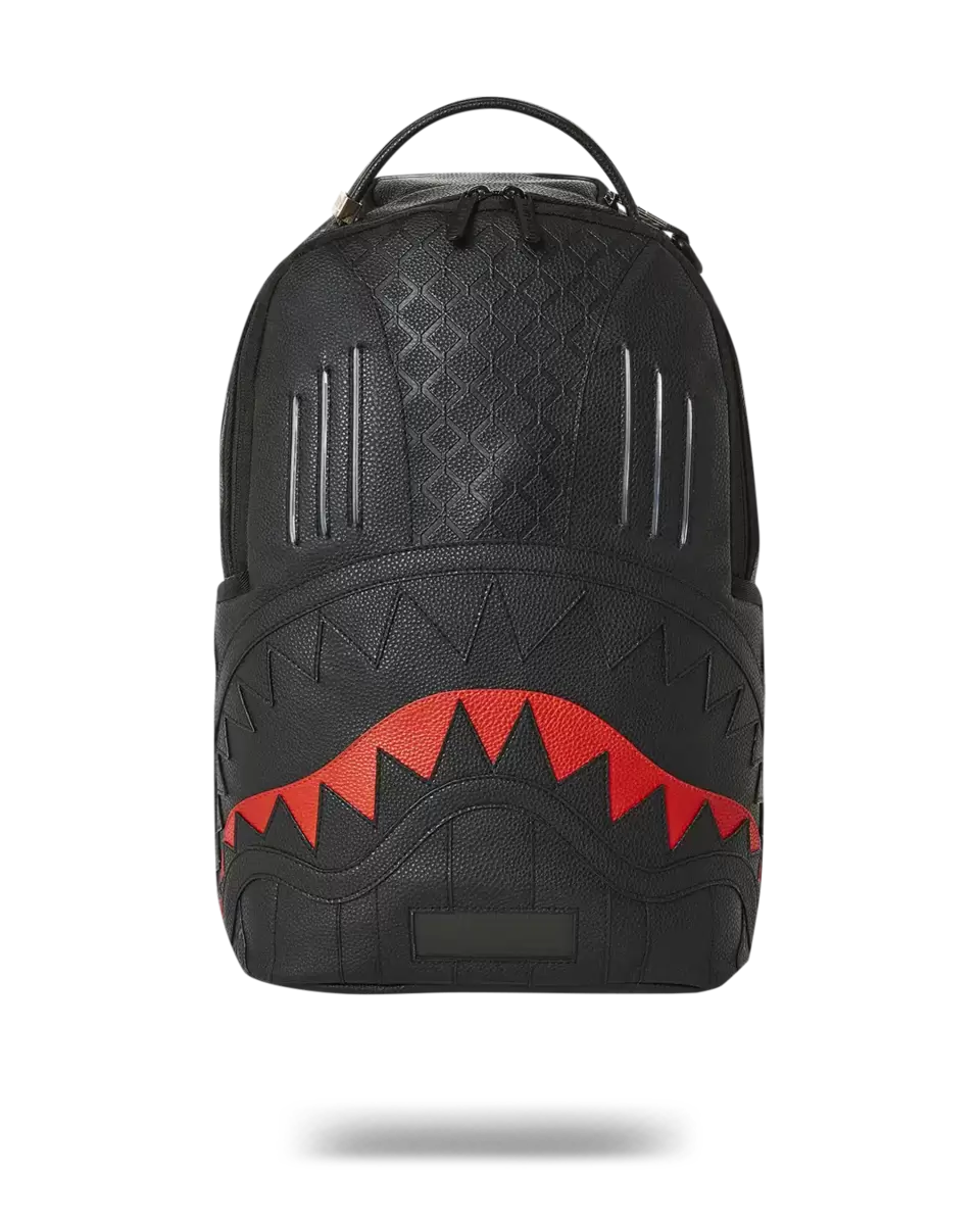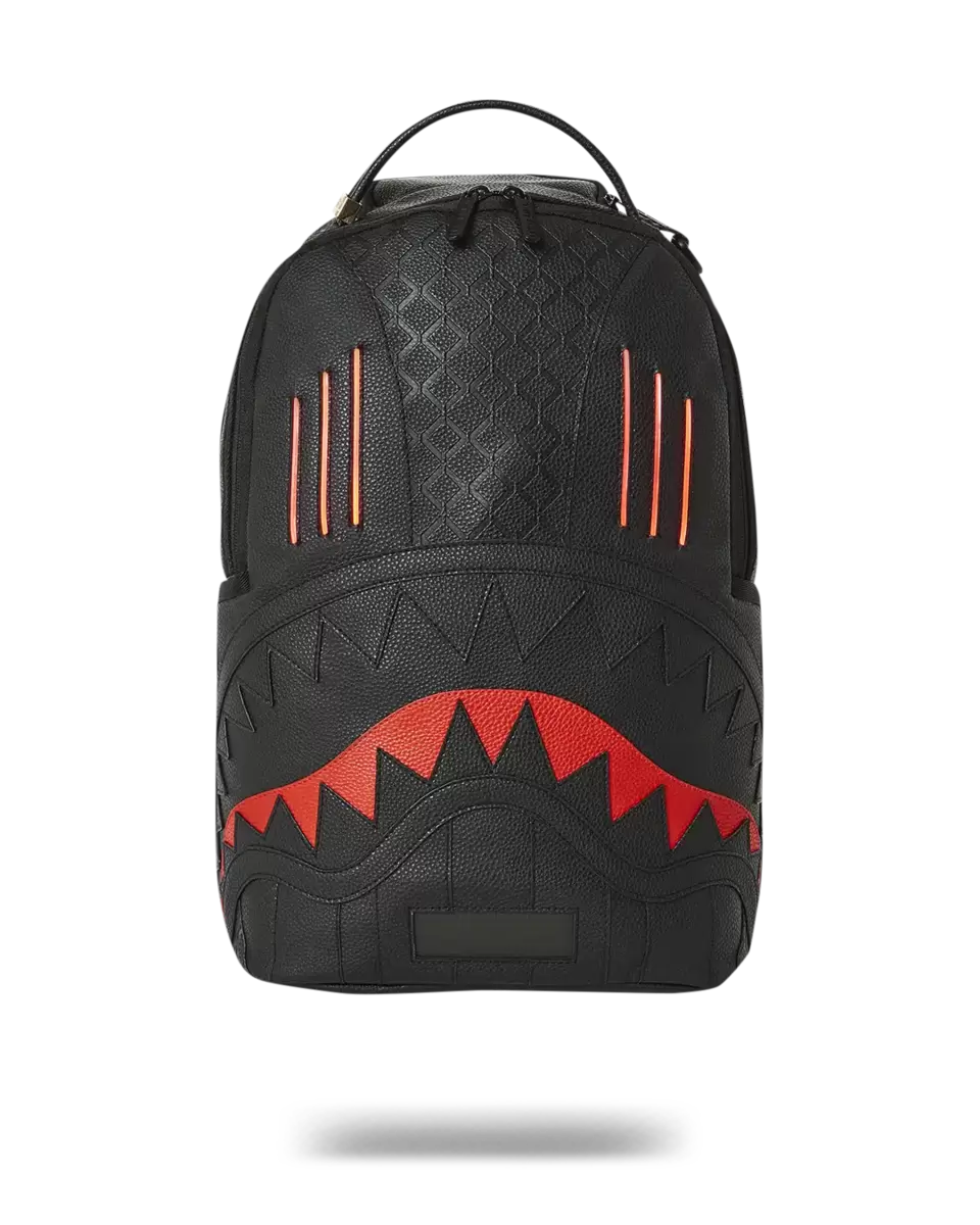 Has all the basic features as a regular DLX PVC backpack 100% PVC Embossed Textured Fabric Details Cut & Sewn Shark Mouth LED running screen at the bottom panel that says “KNIGHT RIDER X SPRAYGROUND” LED Light up front panel in red Charges with a micro USB cord (included)