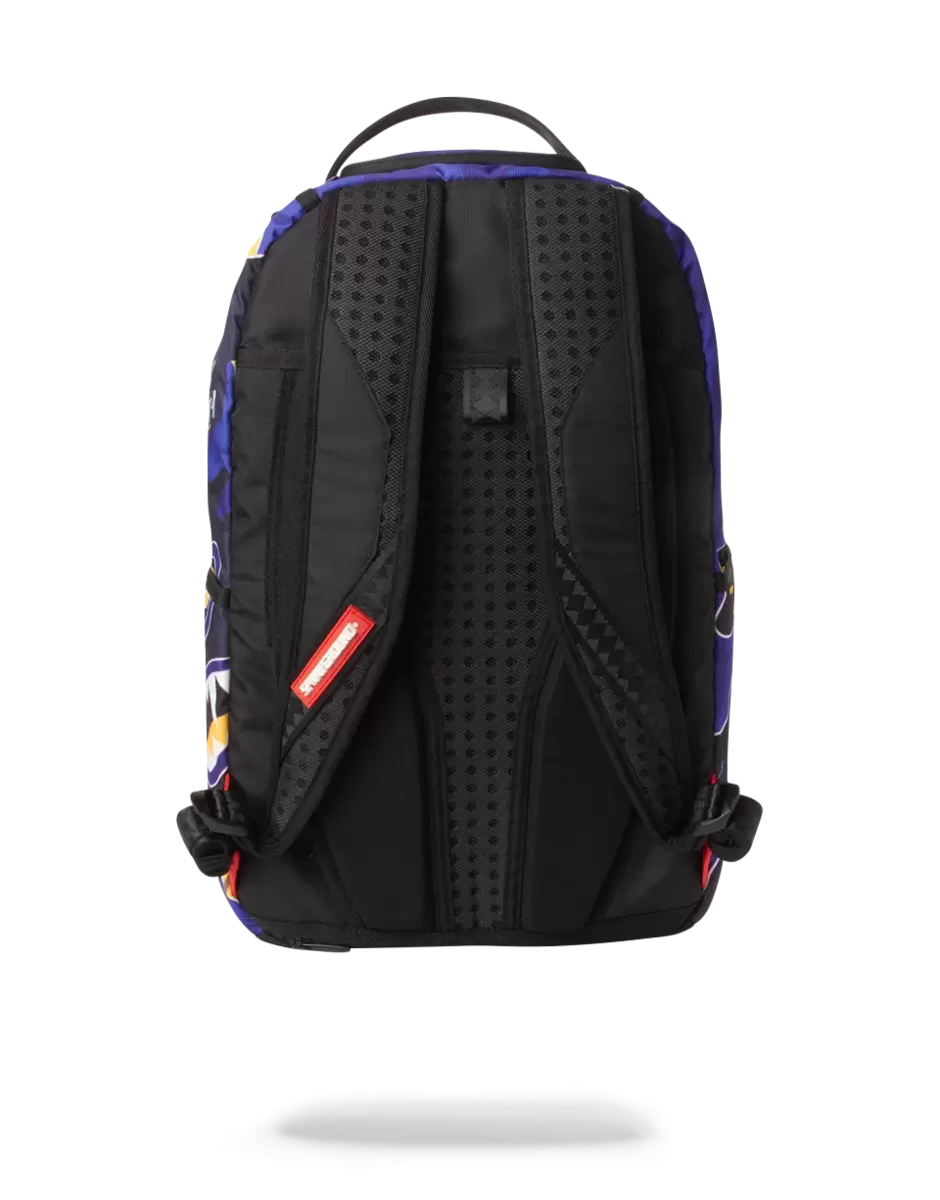 Dimensions: 18″ x 6″ x 11.5″ Front zipper pocket Side pockets Zippered Stash pocket Separate velour sunglass compartment Ergonomic mesh back padding Adjustable Straps for custom sizing Purple zippers with metal hardware Metal “Sprayground Authentic” badge Slide through back sleeve connects to carry-on luggage to free your hands