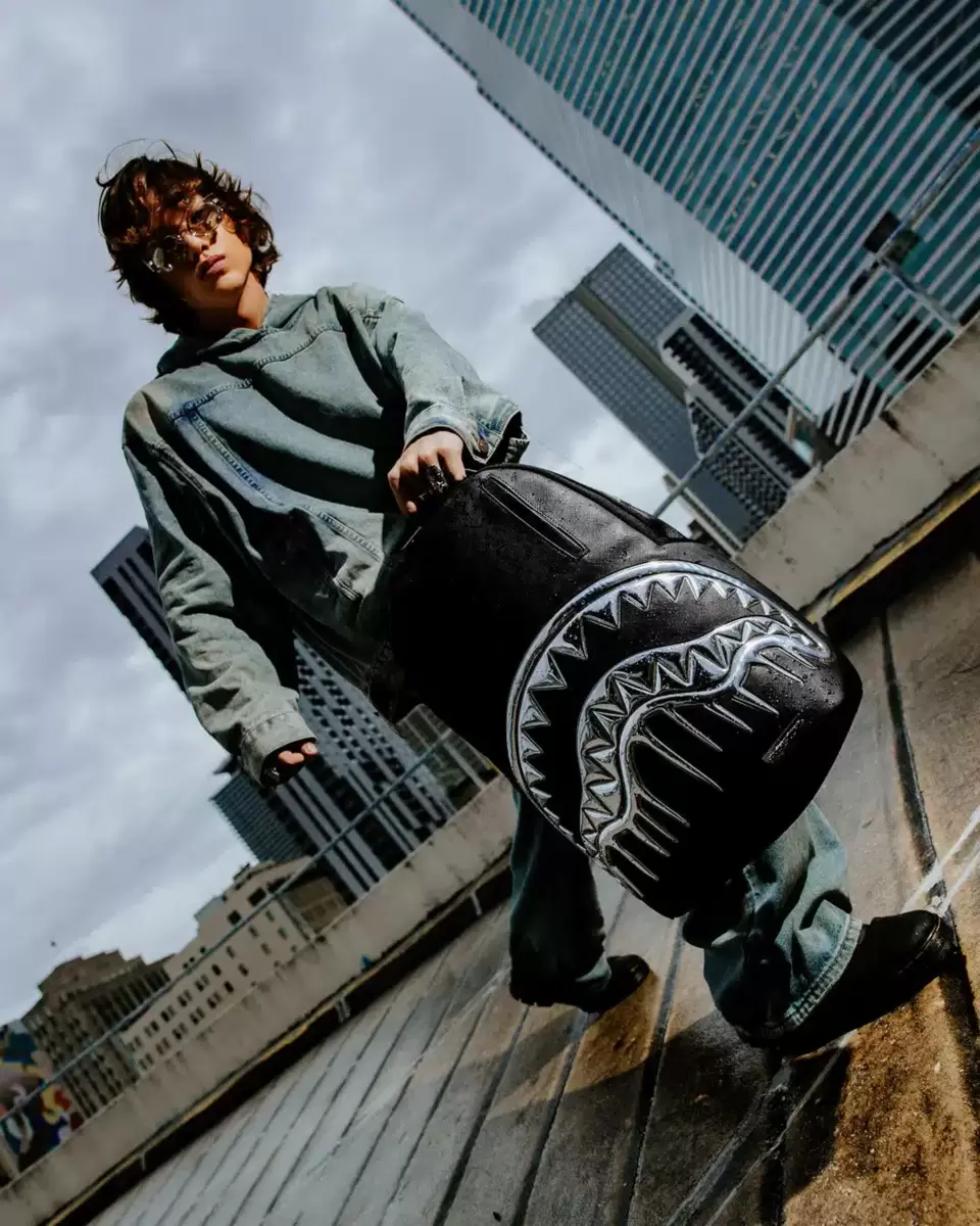 Metallic silver rubber-plastic hybrid sharkmouth Exterior Dimensions 18, x 6, x 11.5, Front zipper pocket, Side pockets, Zippered Stash pocket, Separate ve