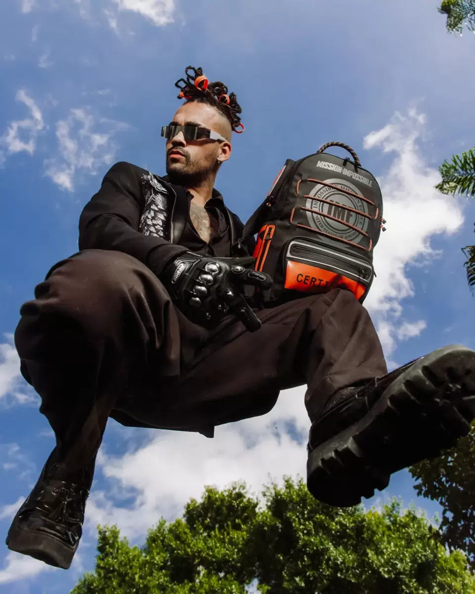 100% rubberized PVC with screen printing and nylon cord detailing. Front cargo pocket with additional side pockets and toprope handle details. Includes special hangtag.