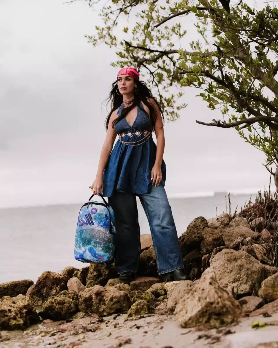 Dimensions: 18″ x 6″ x 11.5″ Front zipper pocket Side pockets Zippered Stash pocket Separate velour sunglass compartment Ergonomic mesh back padding Adjustable Straps for custom sizing Gold zippers with metal hardware Metal “Sprayground Authentic” badge Slide through back sleeve connects to carry-on luggage to free your hands