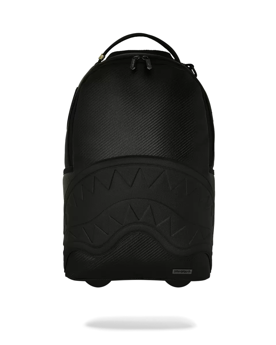 Faux carbon fiber DLX with PVC grain embossed sharmouth, wheels for traveling, bottom of straps can be unhooked to keep clean while rolling, easy zippered compartment for handle storage, suitcase handle sleeve, padded laptop compartment, interior mesh zipper, flat base, embossed zipper pulls, whip stitch luggage tag