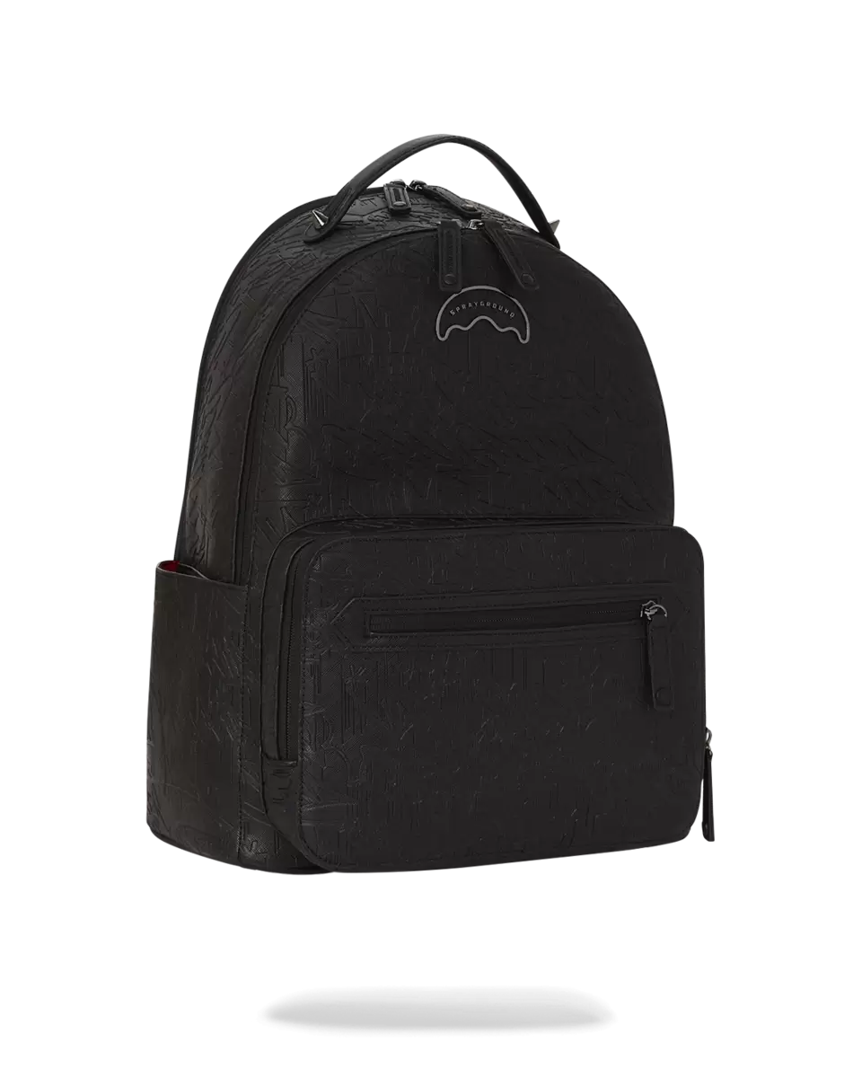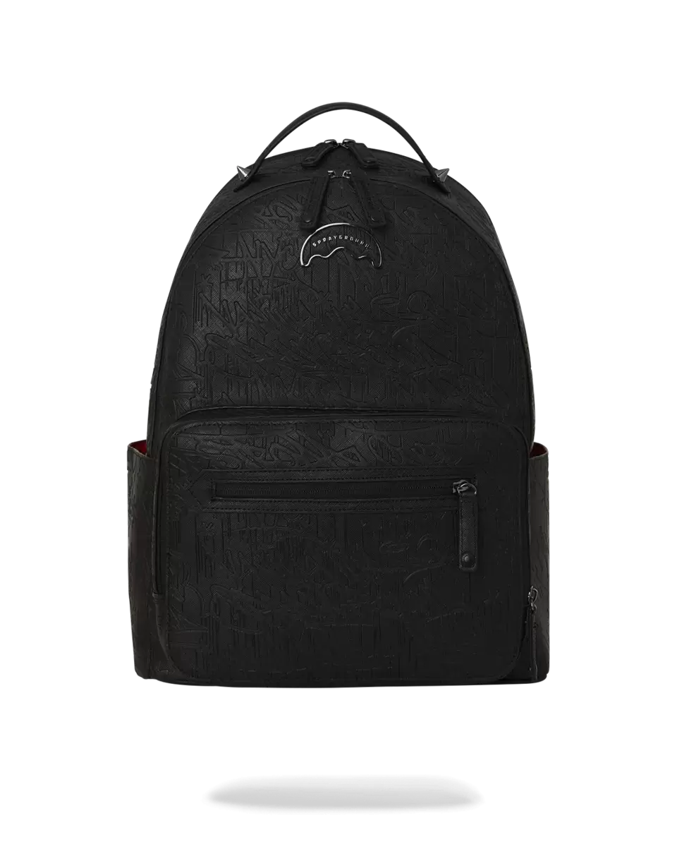Jet Black Embossed Graffiti Collection 100% FAUX LEATHER H 17” x W 12.5” x D 8.5” Multi-functional pockets including Front Zipper Cargo pocket Side water bottle