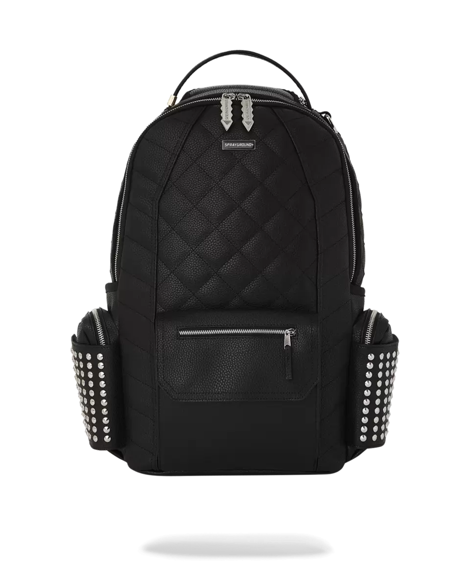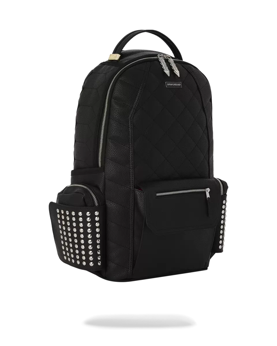 Quilted PVC with stud detailing, unique zipper pullers, extra exterior cargo pocket Exterior Dimensions 18, x 6, x 11.5, Front zipper pocket, Side pockets,