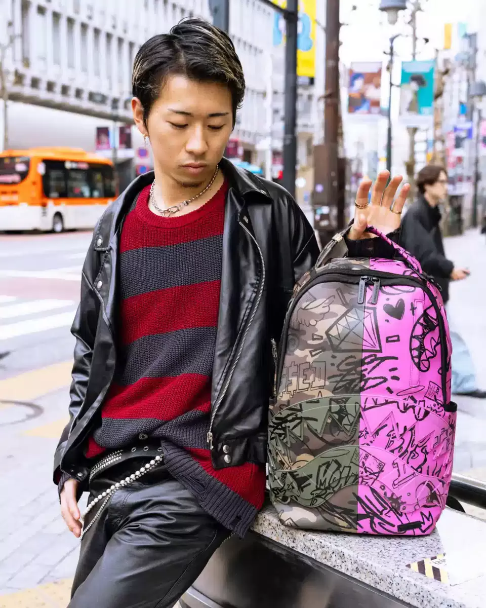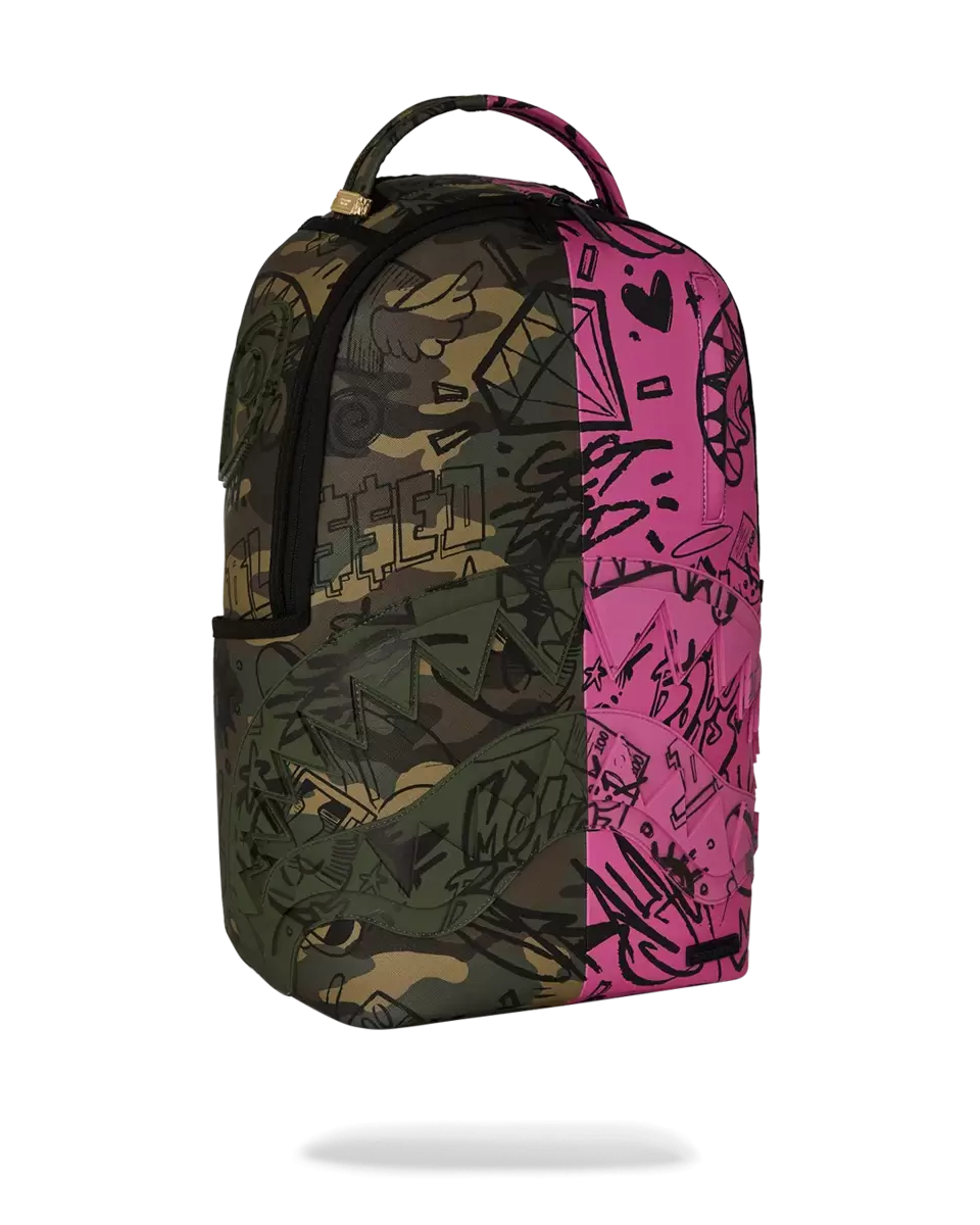 Dimensions: 18″ x 6″ x 11.5″ Front zipper pocket Side pockets Zippered Stash pocket Separate velour sunglass compartment Ergonomic mesh back padding Adjustable Straps for custom sizing Gold zippers with metal hardware Metal “Sprayground Authentic” badge Slide through back sleeve connects to carry-on luggage to free your hands