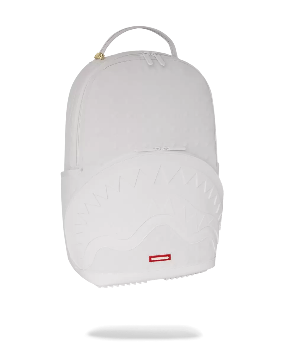 PVC backpack with embossed rubber applique, molded rubber sharkmouth, and rubber bottom.