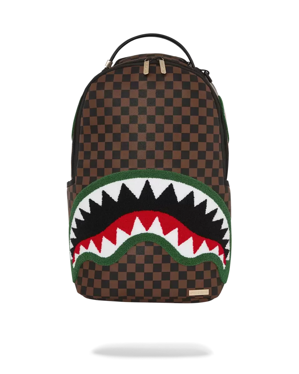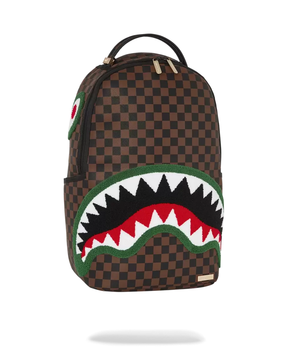 100% PVC Sharks in Paris check pattern on PVC material with textured chenille shark mouth on top featuring gold hardware