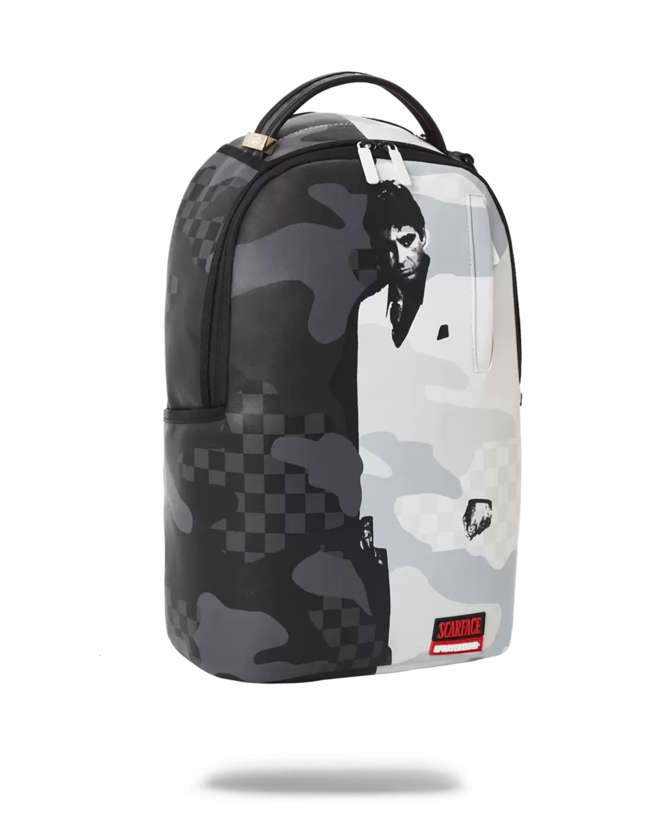 Dimensions: 18″ x 6″ x 11.5″ Front zipper pocket Side pockets Zippered Stash pocket Separate velour sunglass compartment Ergonomic mesh back padding Adjustable Straps for custom sizing Gold zippers with metal hardware Metal “Sprayground Authentic” badge Slide through back sleeve connects to carry-on luggage to free your hands