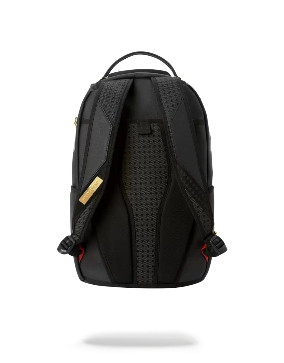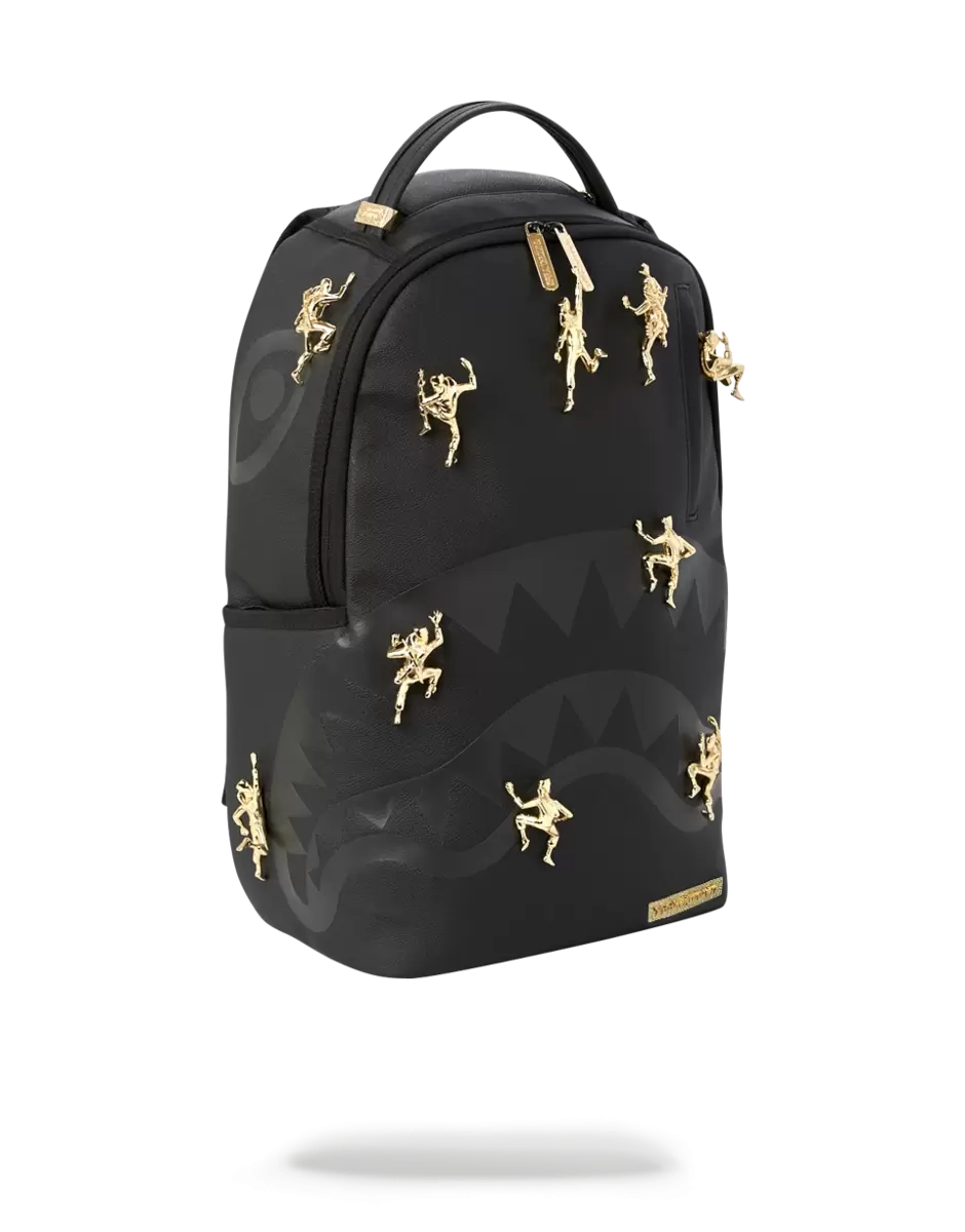 11 Die-Case Gold Metal 3D Ninja’s Permanently Attached to the Backpack. Vegan Leather w/ Black Shark Bag. Dimensions: 18″ x 6″ x 11.5″ Gold ninjas and zippers with Gold metal hardware Front zipper pocket Side pockets Zippered Stash pocket Separate velour sunglass compartment Ergonomic mesh back padding Adjustable Straps for custom sizing Metal “Sprayground Authentic” badge Slide through back sleeve connects to carry-on luggage to free your hands