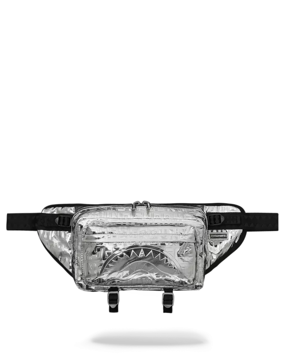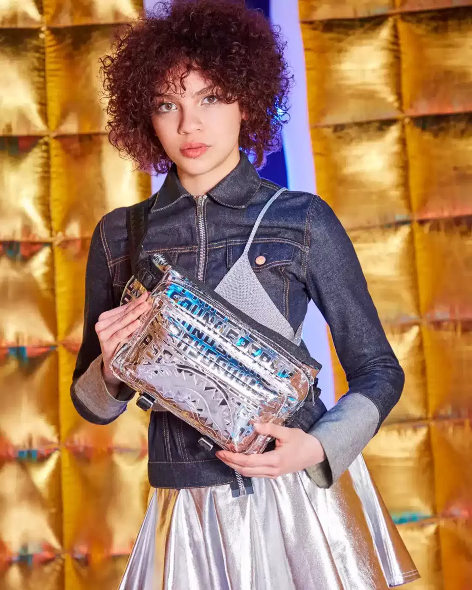 Embossed Sprayground logo on Metallic Silver PU with mirror-like shine