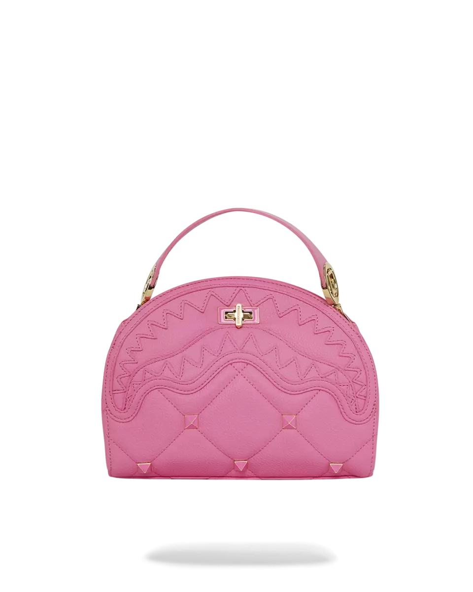 Quilted and embellished pink/ gold enamel studs & custom Sprayground logo hardware H10” x W6” x D2.5” Turn-lock closure Interior zipper pocket Can be worn handh