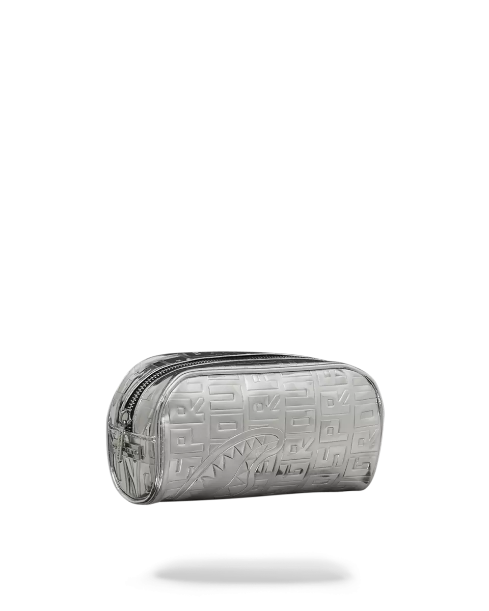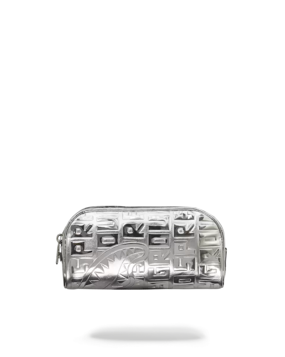 Small pouch perfect for anything from pencils to makeup Dimensions 4, x 2.75, x 8, Zipper top opening Embossed Sprayground logo on Metallic Silver PU with mir
