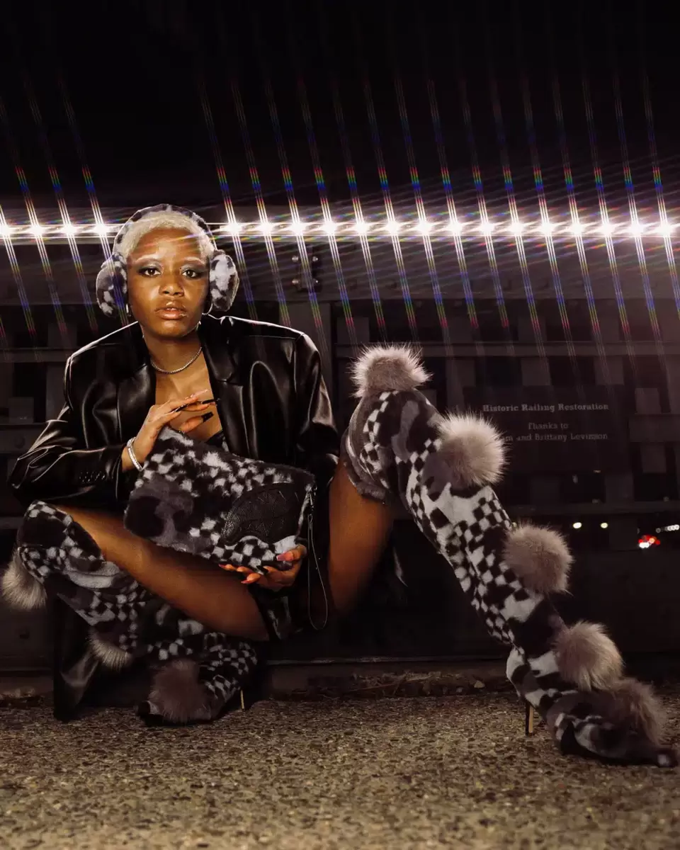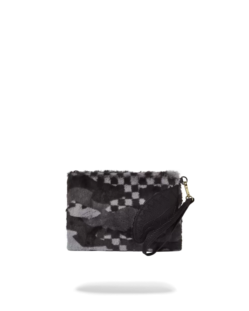 100% FAUX LEATHER 100% Polyester Faux fur printed in our custom check/ camo patterns Convertible Clutch “Pouchette” Pouch with removable wristlet strap, Handle
