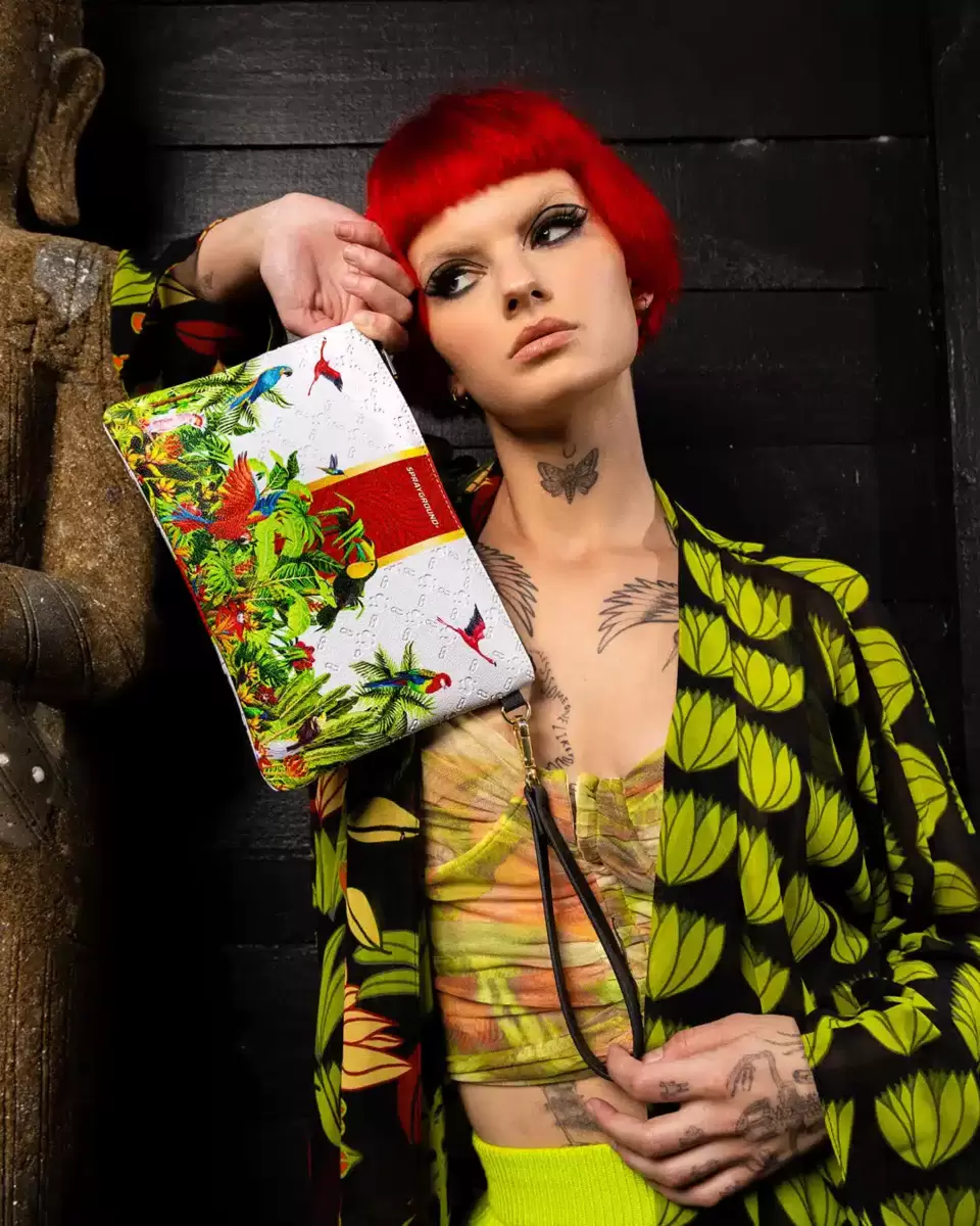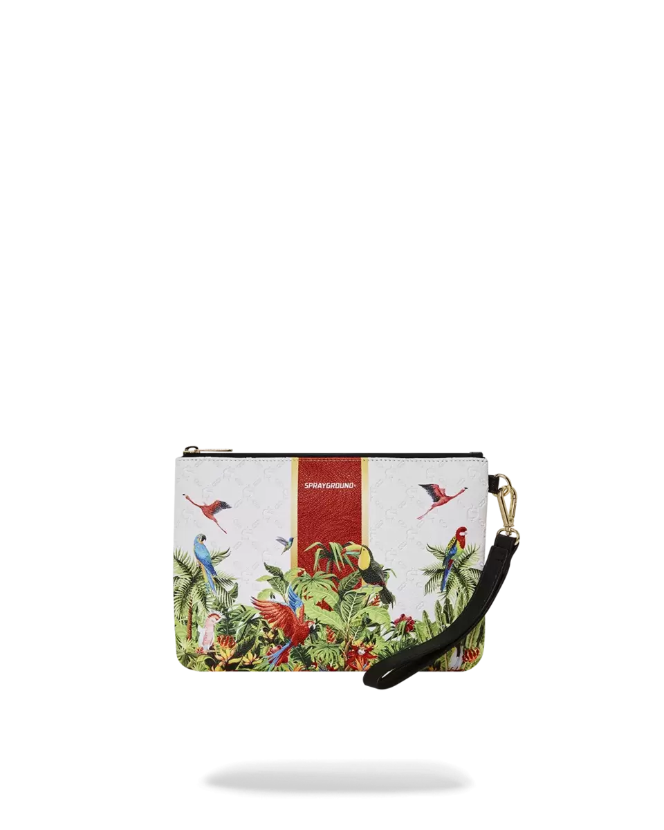 Pouch with removable wristlet strap, Handle on front panel, Zip Closure1 interior pocket7″ X 10″ X 0.25″