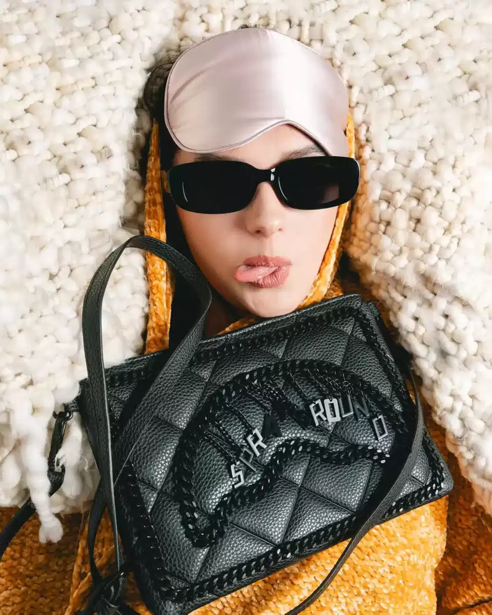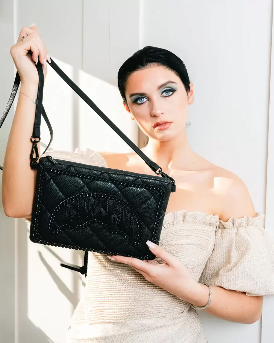 100% PVC quilted black faux leather featuring black chain hardware and hanging charm logo.