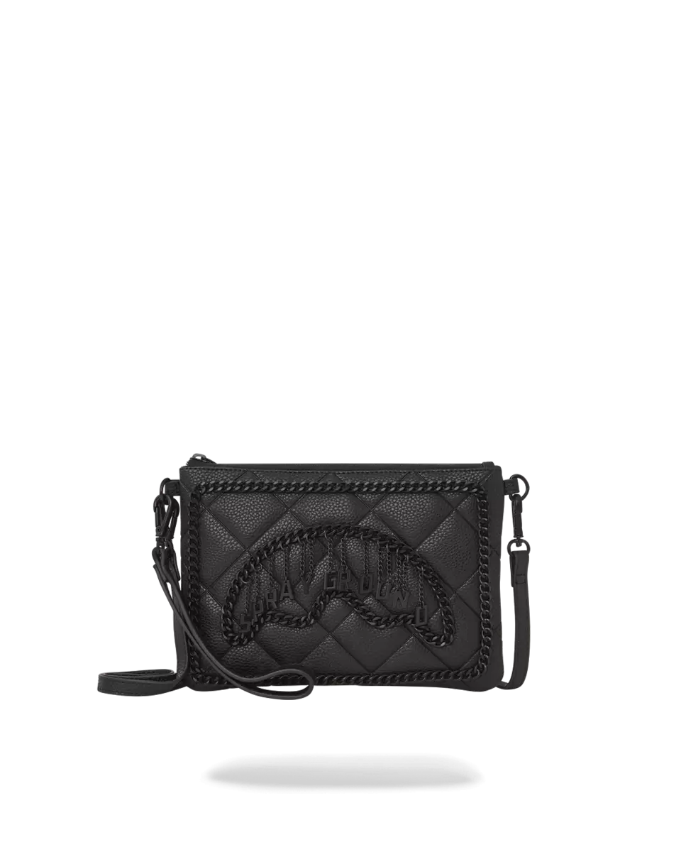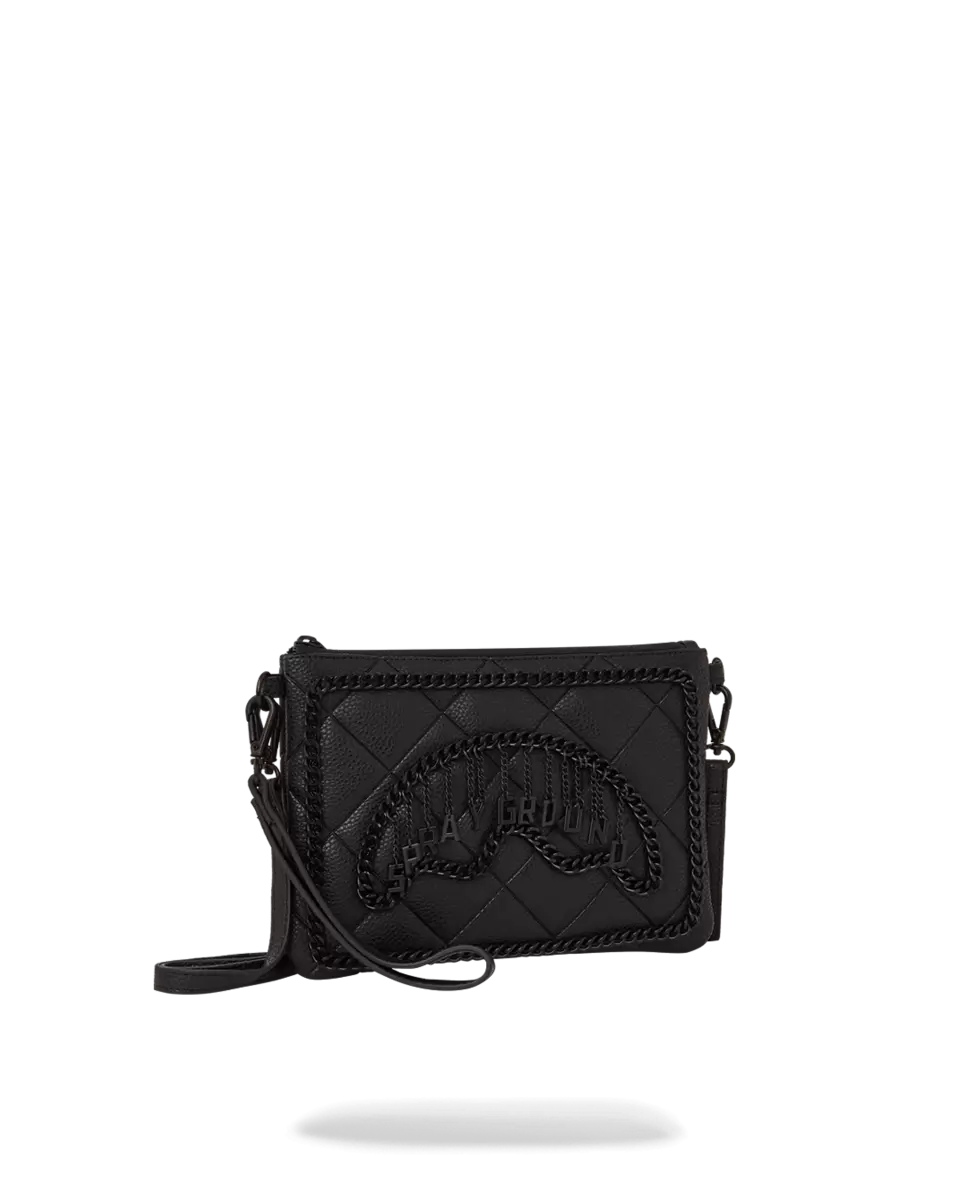 100% PVC quilted black faux leather featuring black chain hardware and hanging charm logo. Convertible Clutch “Pouchette” Pouch with removable wristlet strap, H