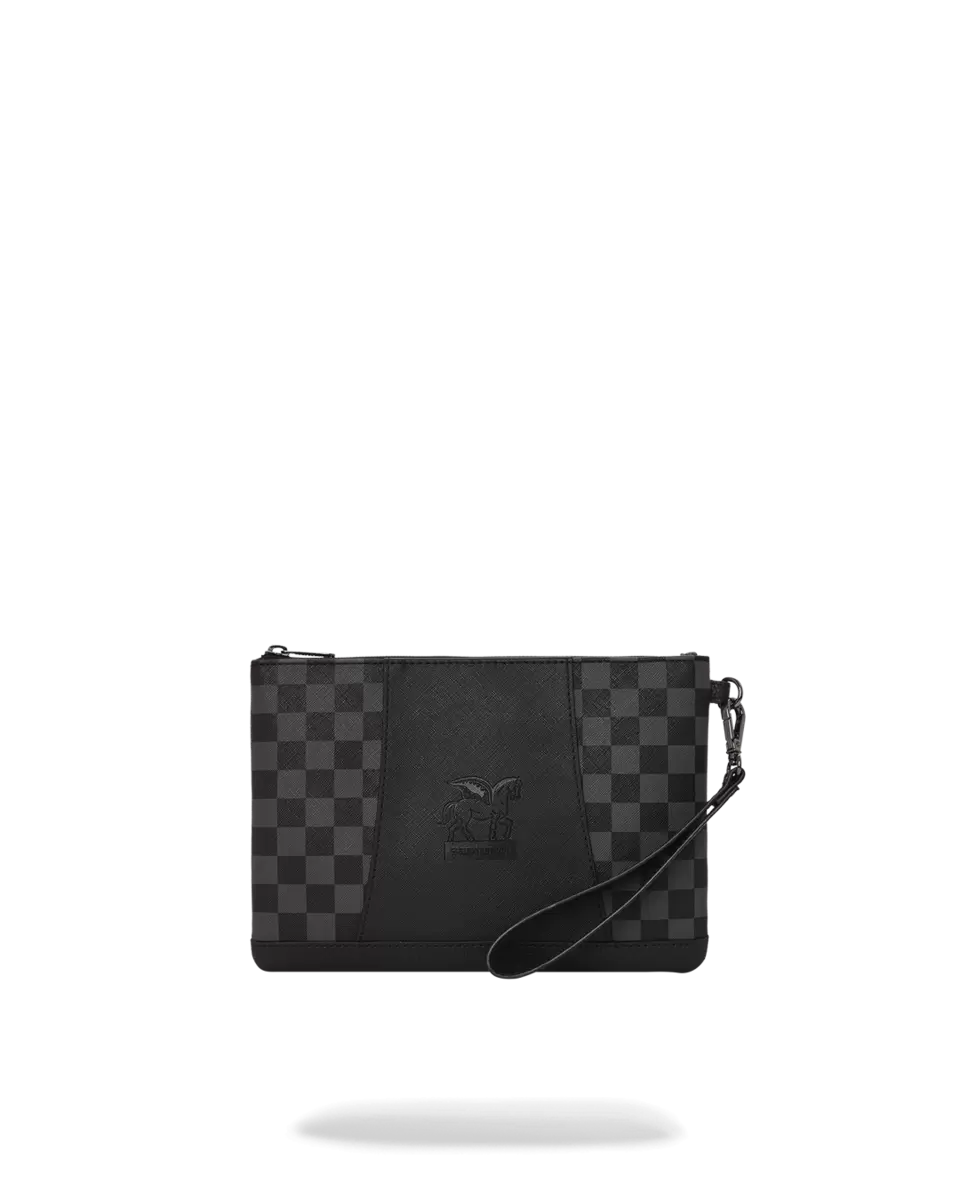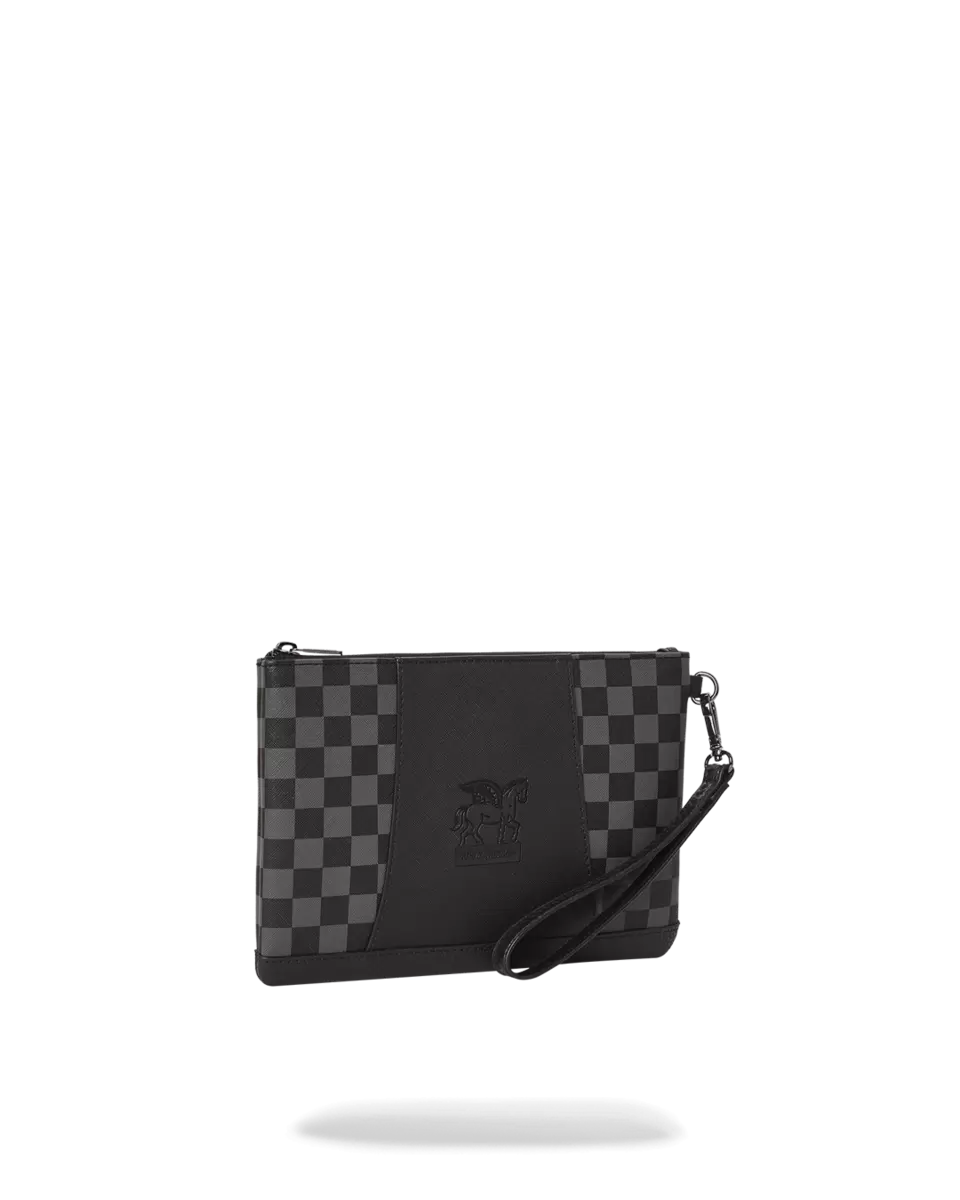 Pouch with removable wristlet strap, Handle on front panel, Zip Closure1 interior pocket7″ X 10″ X 0.25″
