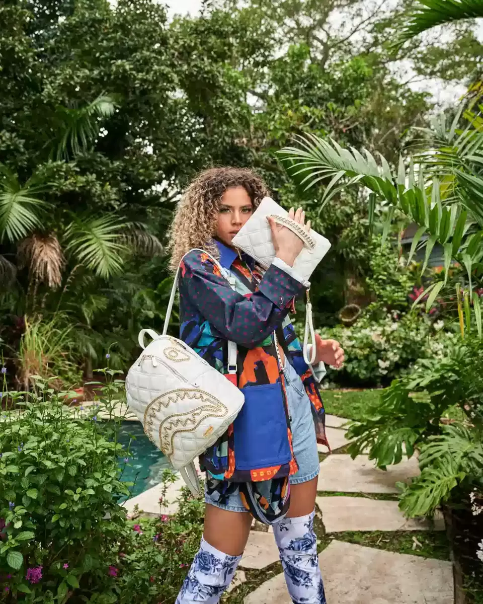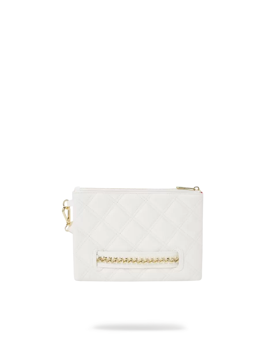 100% FAUX LEATHER Quilted in a double needle diamond Delicate gold chain applique details Gold metal hardware Convertible Clutch “Pouchette” Pouch with removabl