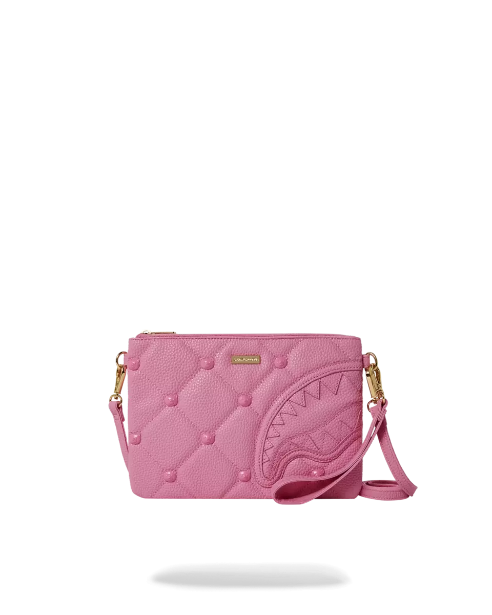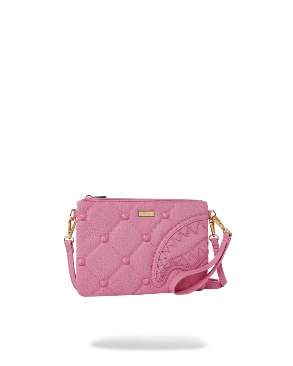Pink quilted with bear face studs. Pink enamel & gold hardware details Convertible Clutch “Pouchette” Pouch with removable wristlet strap, Handle on front panel