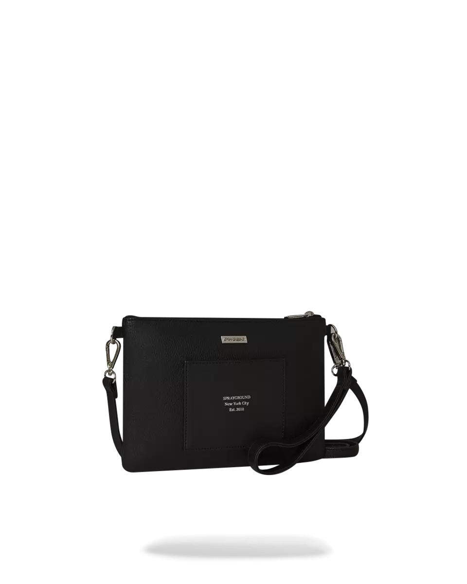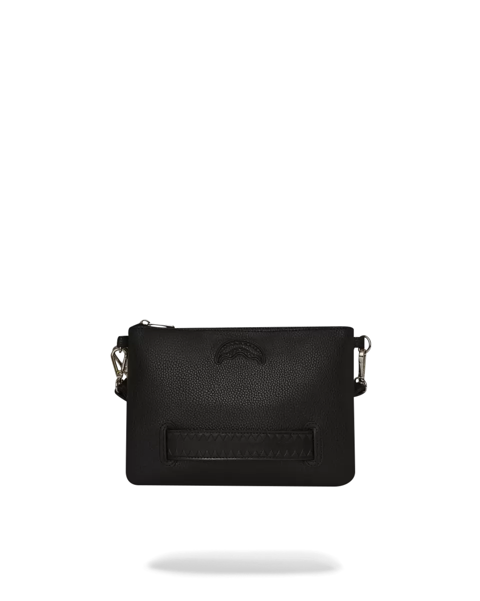 Cut and sew sharkmouth shape with embossed silver foil lettering Convertible Clutch “Pouchette” Pouch with removable wristlet strap, Handle on front panel, Zip