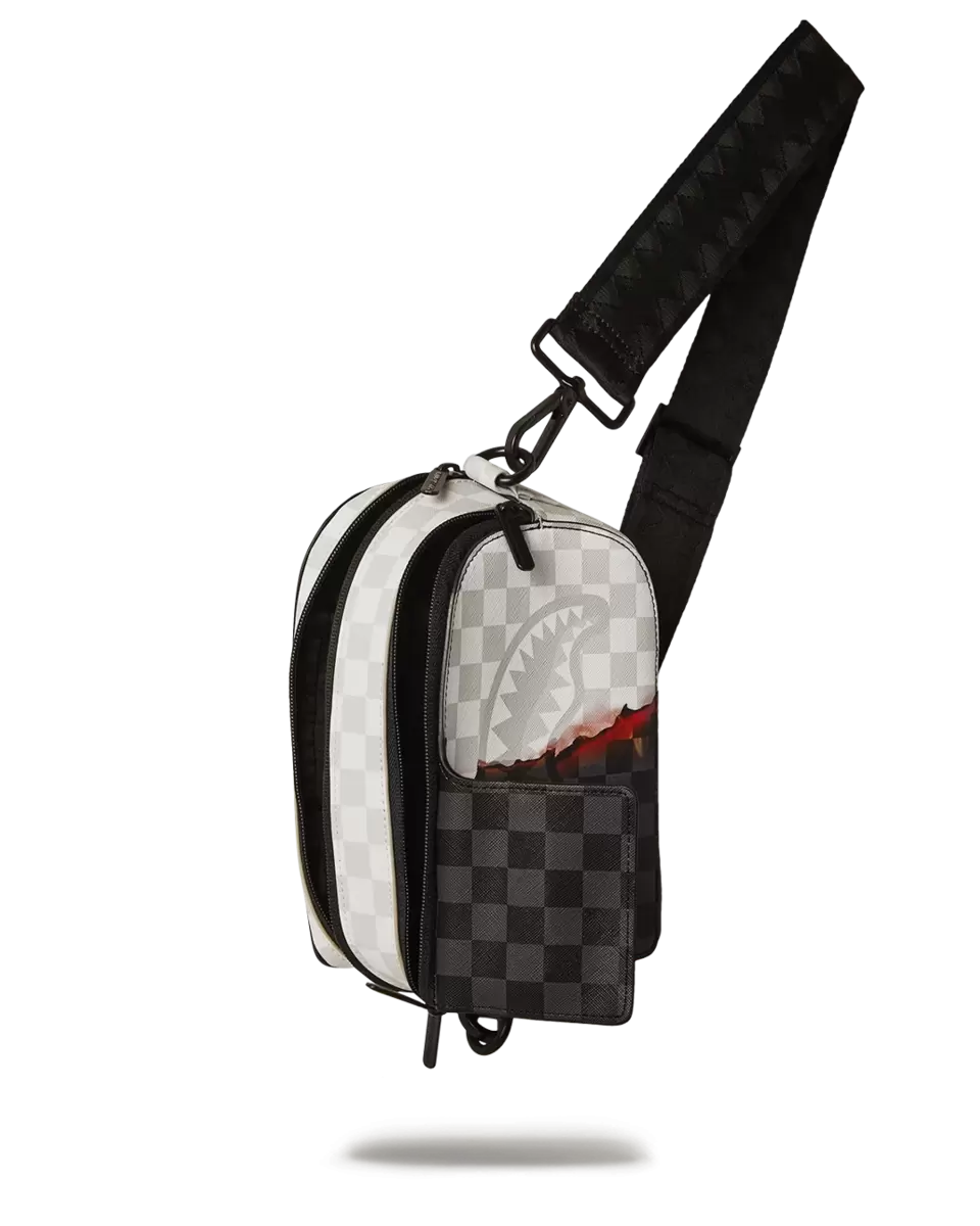 Size: H 8″ x W 5.5″ x D 3″2 Zippered Compartments Can be worn on back or on the front of the bodyAdjustable Vertical Shark Mouth webbing strap