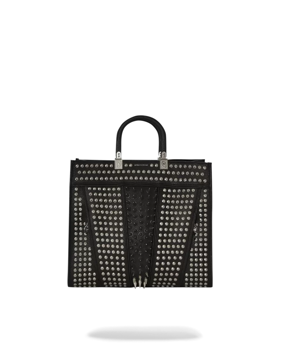 PVC leather with metal spikes and studs all over, metal handle tacks with PVC wrapped handle, attachable strap with more spikes and studs