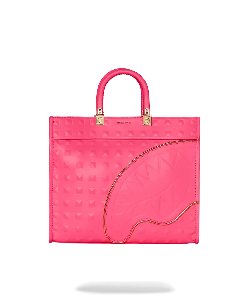 Grained embossed leather, embossed faux leather applique with gold piping. Sprayground hardware on handles