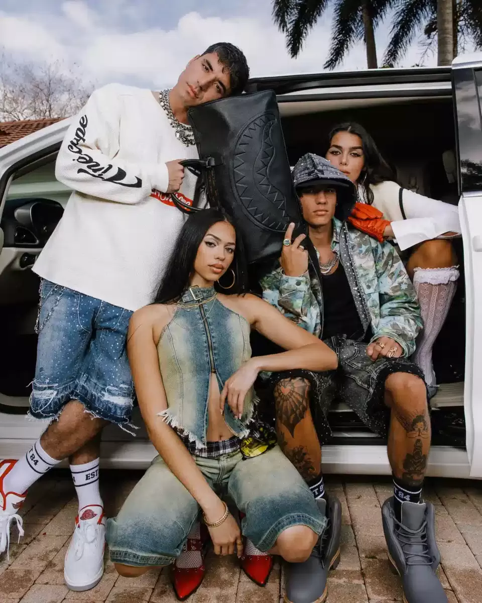PVC bag with embossed details such as the sharkmouth and zipper pullers Sewn faux leather details around the front zipper pocket.