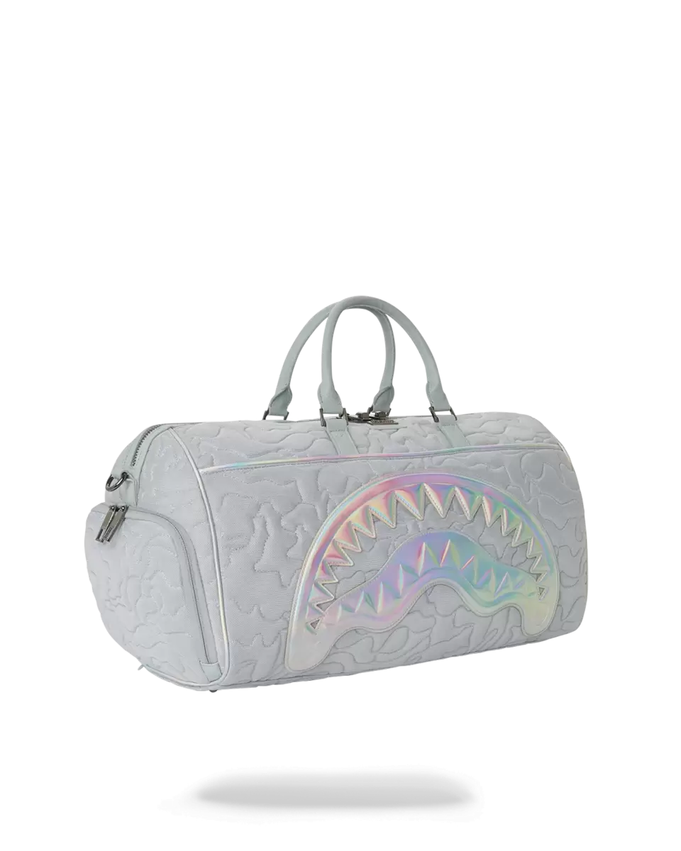 The styles are trimmed with matching faux leather trims and accented with iridescent welded shark mouths and gunmetal hardware.