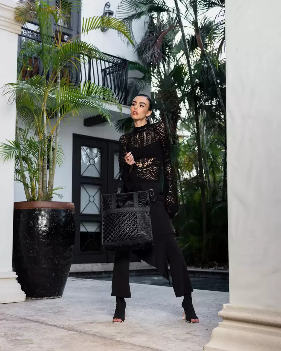 PVC carry-on with flocking technique, PVC applique, and cut and sew sharkmouth 100% FAUX LEATHER Dimensions 16,H x 14 1/2, W x 8, D New shape featuring one bac
