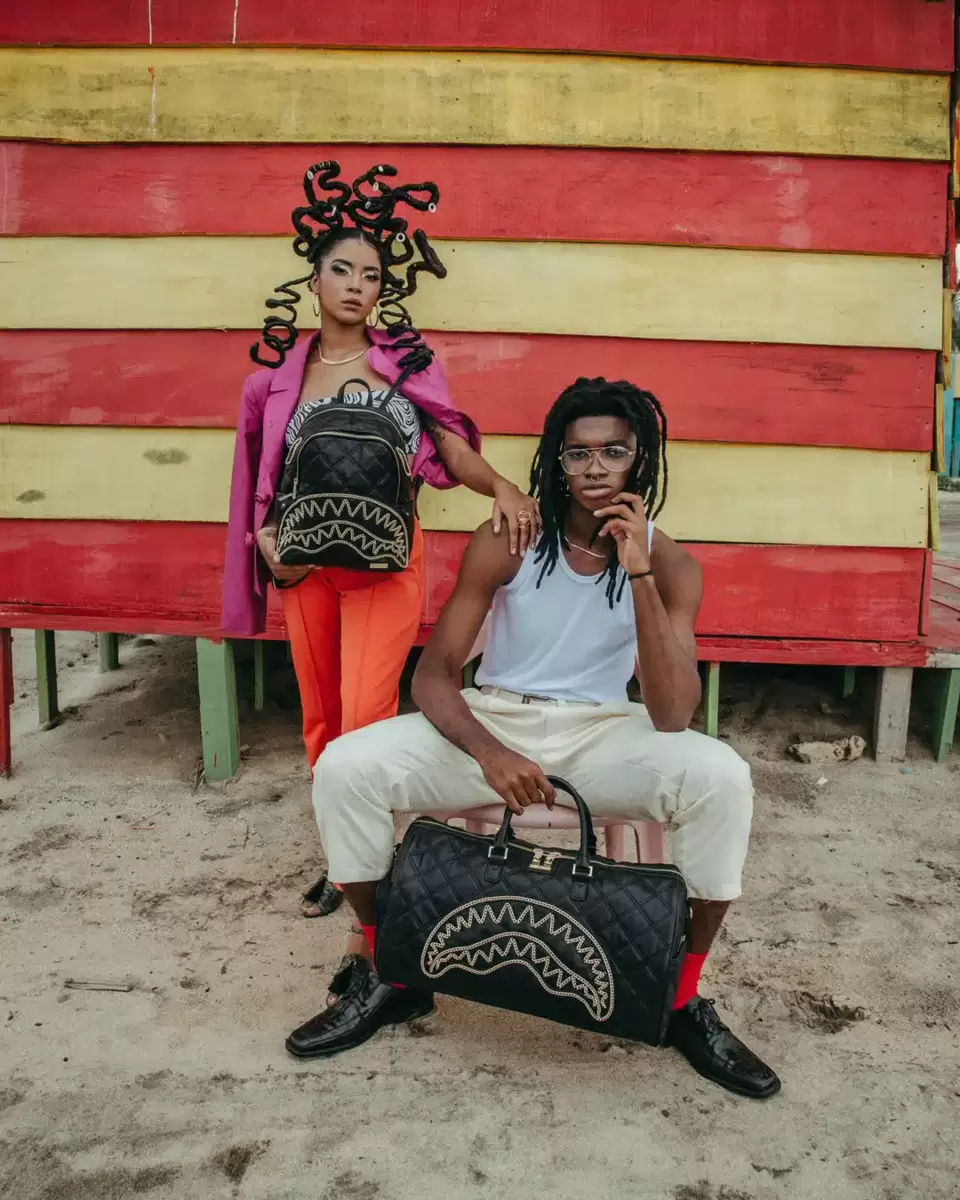 Dimensions: 20″ x 10″ x 10.75″ Metal zipper pocket Back Zippers Zippered sneaker pocket gold zippers Adjustable Straps for custom sizing Metal Zippers with Metal Hardware bag of Sprayground money