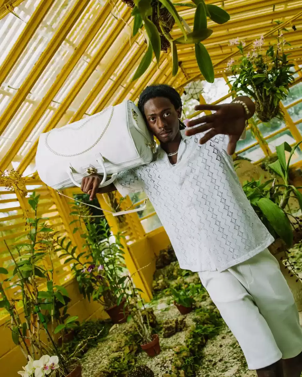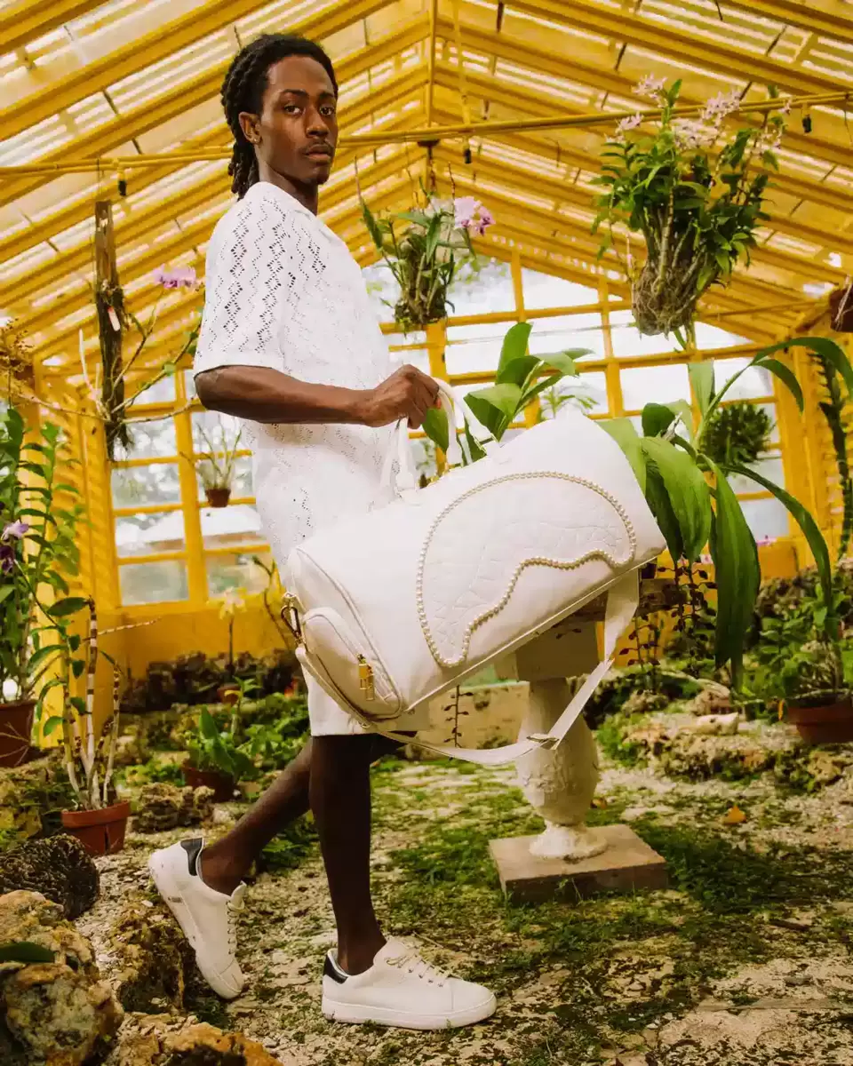 100% PVC embossed sharkmouth embellished with faux pearls featuring gold hardware