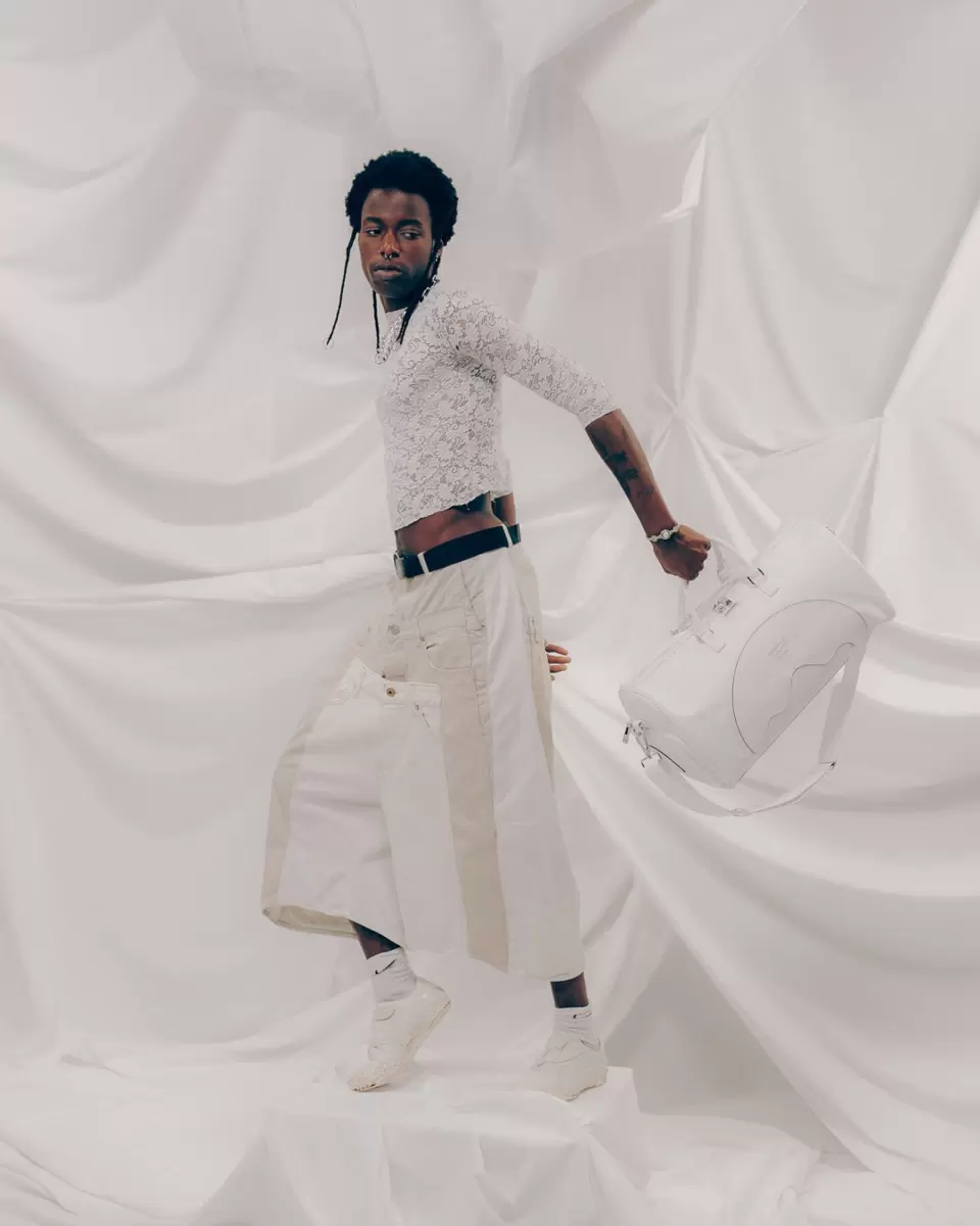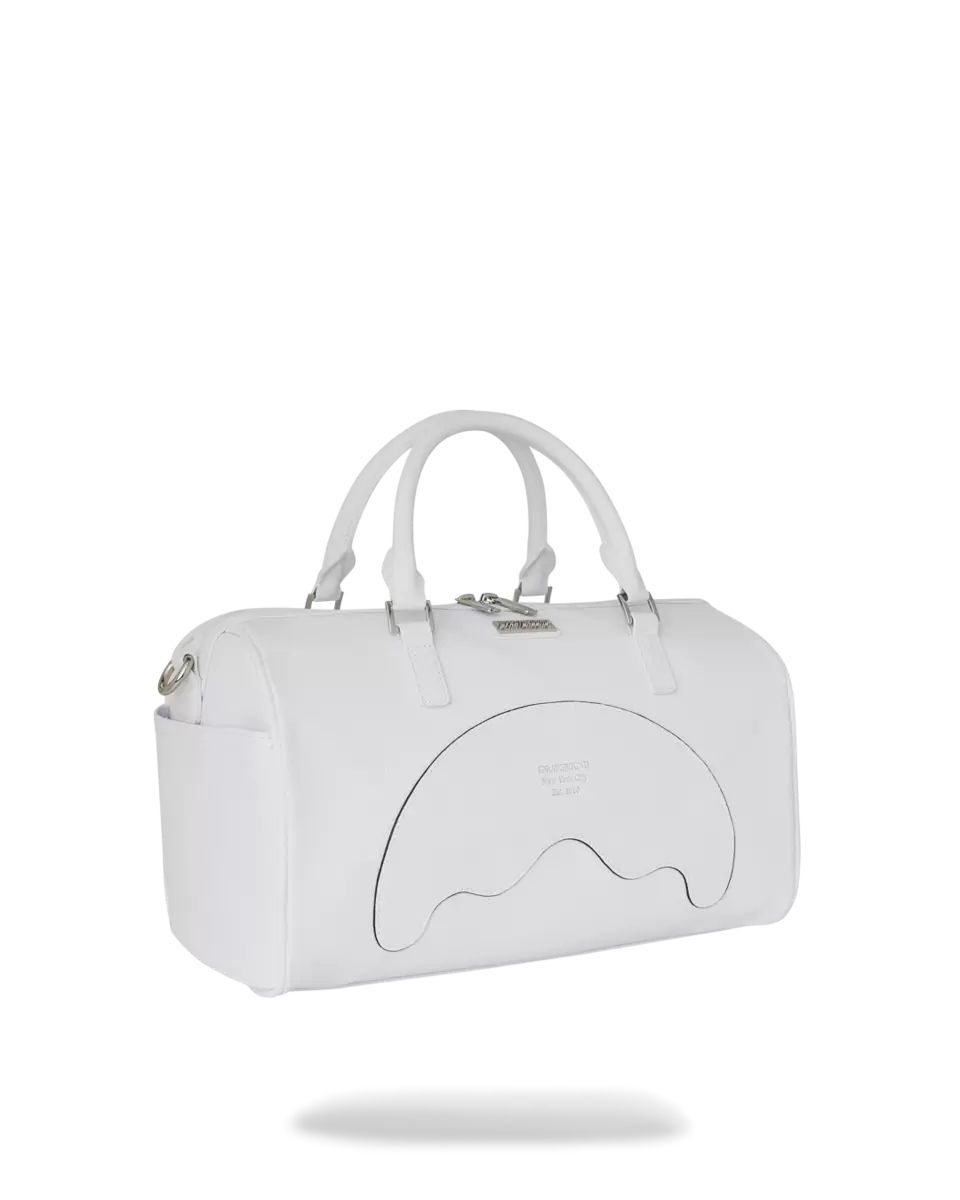 Cut and sew sharkmouth shape with embossed silver foil lettering.