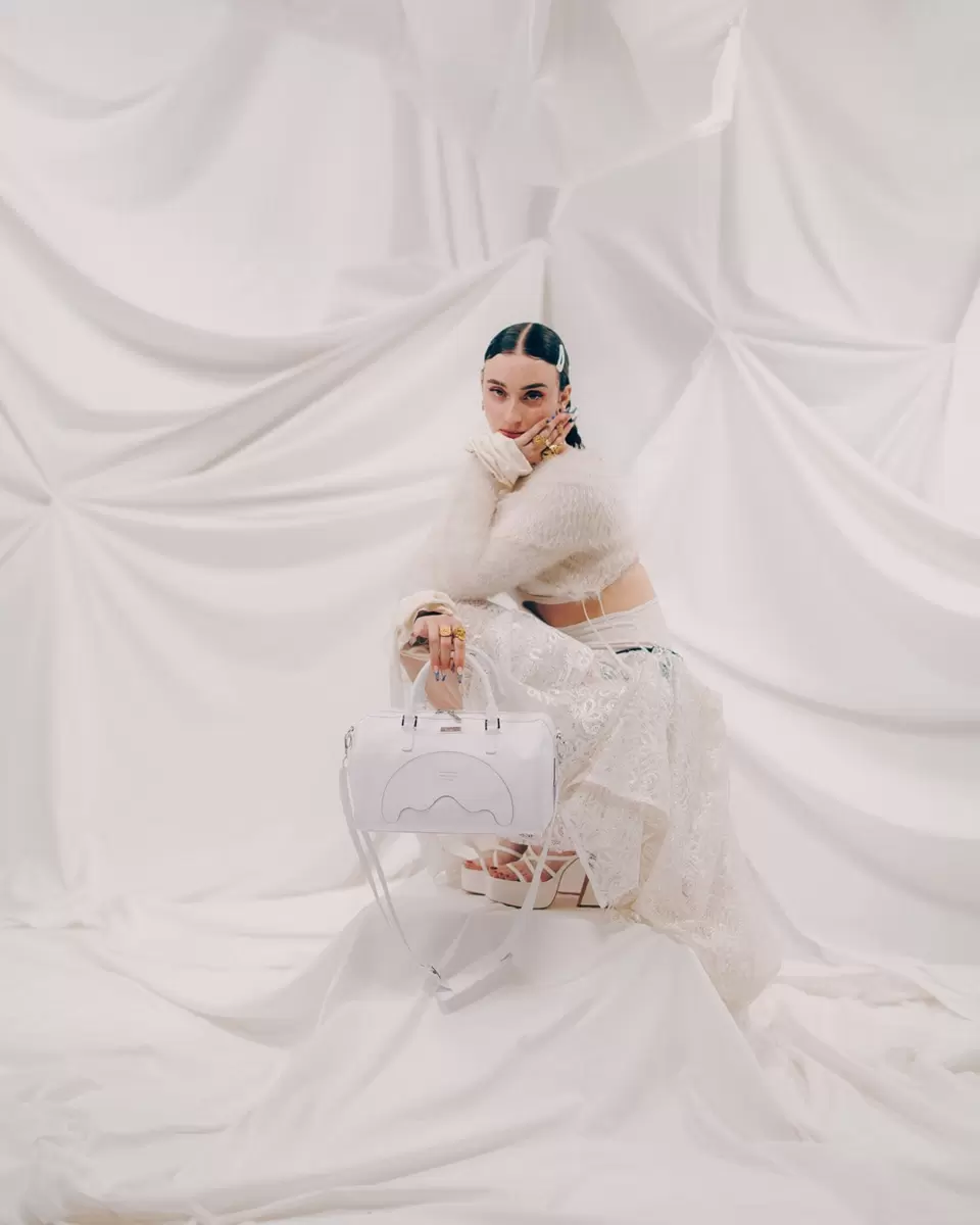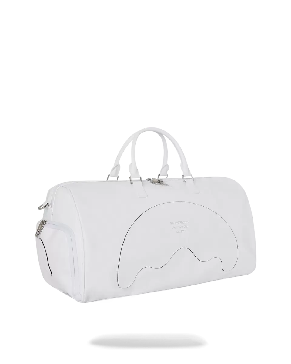 Cut and sew sharkmouth shape with embossed silver foil lettering.